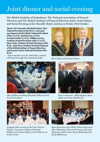 Joint dinner and social evening The British Institute of Embalmers, The National Association of Funeral Directors and The British Institute of Funeral Directors held a Joint Dinner and Social Evening at the Dunsilly Hotel, Antrim on Friday 17th October. Master of Ceremonies Marshall Lindsay (Past National President of the B.I.E.) welcomed special guests Paul Cuthell, National President of the N.A.F.D., David Gresty, 1st Vice President of the N.A.F.D., William Garvin, Northern Ireland President of the N.A.F.D., Hans Clyde, Northern Ireland Chairman of the B.I.E., Alan Wray, Northern Ireland Chairman of The British Institute of Funeral Directors and Graeme Easton National President of the B.I.E. Guest speaker was Dr. John Kerr, retired GP from Garvagh who entertained the