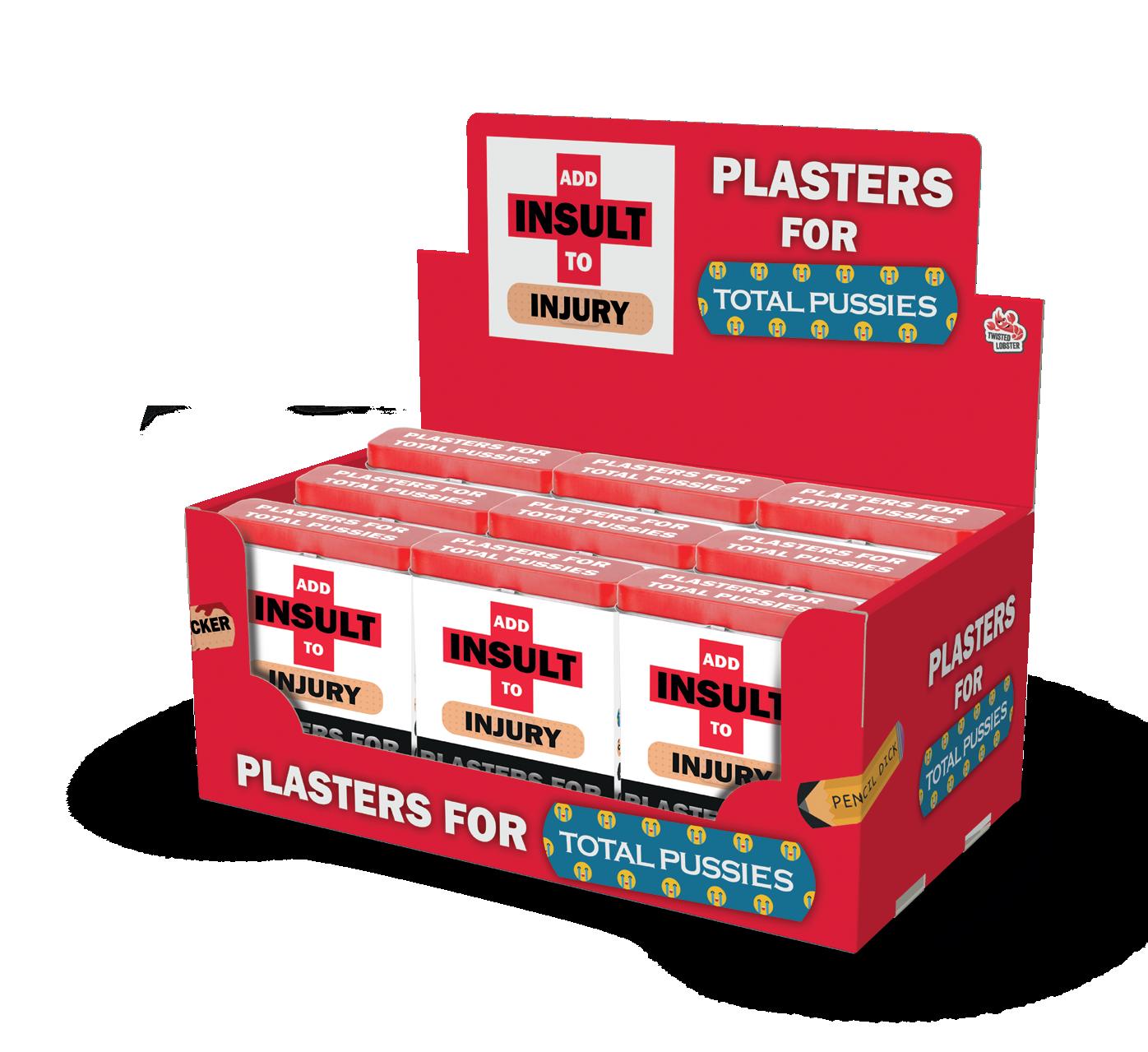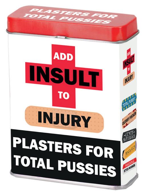 Plasters for total pussies. Each tin contains 25 offensive plasters which literally add insult to injury.