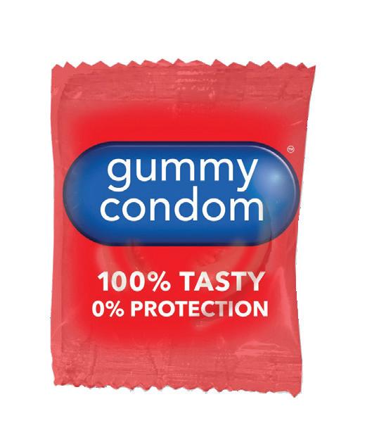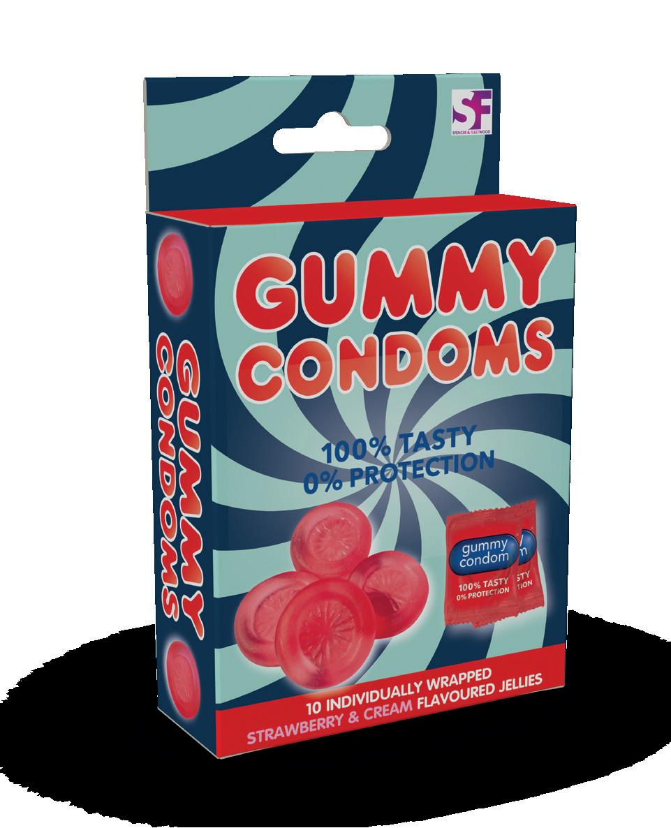 Ten individually foiled strawberry and cream flavour gummy condoms. Extremely tasty but not in the slightest bit effective as contraceptives.