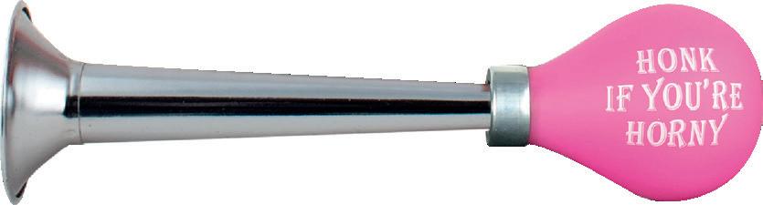 Traditional metal horn with a pink rubber honker. Squeeze the end and make yourself known.