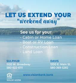 How about spending your vacation time in a true home away from home? A few days at the Choose Happy Cabin will provide an experience you will find hard to leave. Plan on loving your time away and your stay. Choose Happy Cabin is well-appointed and it is obvious that attention has been paid to every detail. The comfort and relaxation of their guests is the priority. A full house to enjoy, room for up to 8 people, everything furnished, and minutes away from Arbuckle Lake. Relax with morning coffee on the porch, enjoy time around the firepit, and create memories (and healthy competition) over board games. Soak in the hot tub before falling in to a sound sleep. It is said that happiness is a choice. At this cabin, that is a choice that is easy to make. See page 40 for details and a QR code for booking. Or book online at www.lakeescapegetaways. com or call 580-920-4765.