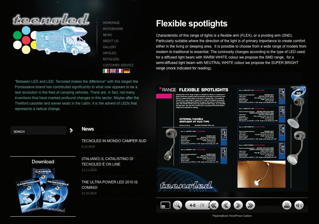 The new Tecnoled Internet website has attractive graphics and a lot of information for the end customer audience. The news section is updated periodically in all languages and the catalogue can be browsed, page by page, thanks to special software which allows online viewing of the pdf files