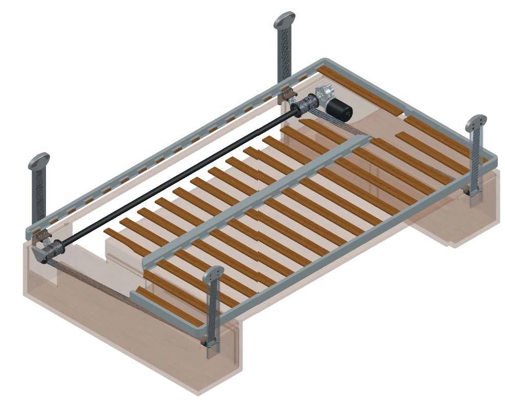 drop in orders, but the numbers nue to be satisfactory. On the other hand, produc tion of lift system mechanisms for front folding beds in semi-integral vehicles has grown. This is a tendency which has developed quite a bit over the last two years is that we have supported with a highly innovative product. In fact, we did not limit ourselves to motorising the classic pantograph mechanism, but we redesigned a completely new system which permitted great exibility of installation for outf itters who were able to create folding beds of any size and shape. Also, our systems provide fluid, silent and precise movements in addition to being made from reliable and sturdy components. Our primary business is also the produc tion of brackets for LCD televisions: ceiling mount, with rotating base, extractable, wall mount with ver tical ush mount, flush mount with electric movement».