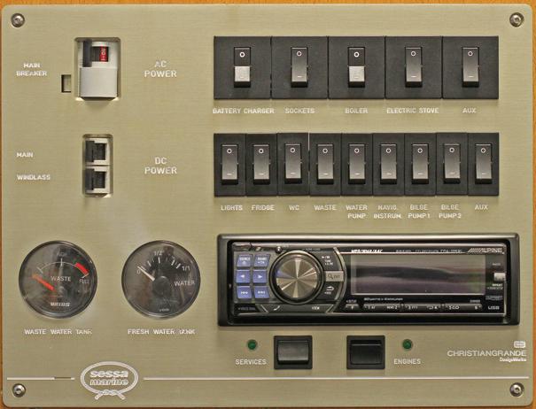 start and a stimulating challenge - states Dorian Sosi, sales director for the Italian marketThe path which we have taken with the Sessa Marine boatyard gives us the opportunity to export the refined technology which belongs to our products to the nautical sector also in the future ». CBE realised a control panel for Sessa Marine which reproduces the aesthetic and func tionality of the previous one, but it industrialised the produc tion process. The panel wiring is constructed directly by one of the CBE produc tion units and meets the high quality standards which characterise the thirty year old company. The control panel of the C35 Sport-Coupé integrates a radio, the 12 and 220 Volt system magnetothermic switches and two potable and waste water level indicators. A double row of switches also allows control of the lights, refrigerator, pumps (potable water, WC, recovery tank, bilge), boiler, electric oven, electrical outlets, battery charger and auxiliary utilities. «The panel supplied to Sessa Marine contains neither a digital display nor sophisticated electronics. It is a traditional system, all analogue, which controls the utilities of the craft and manages the electrical system. «It is a project which has no technological