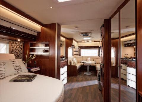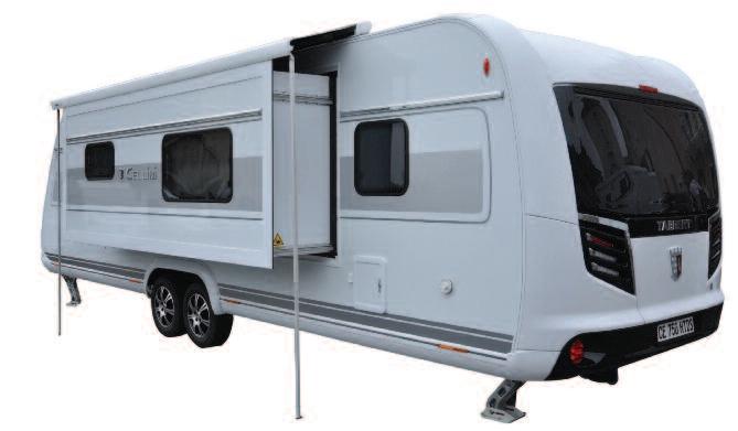 offers Tabbert’s production flagship, the Cellini 750 HTD, is indeed available both in " s t a n d a rd " v e r s i o n a n d e x t e n s i b l e w a l lequipped one: with electric up-down system and based on the tried and tested Lippert InWall Slide-Out system which is no longer only aimed at extending the living usable surface, but at significantly increasing the