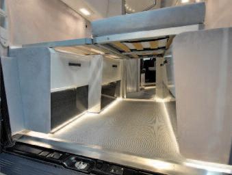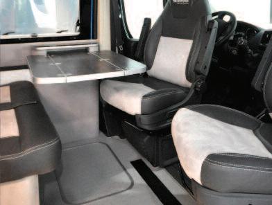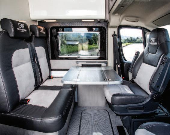 Once again, Project 2000 cooperates with Tecnoform, the Bologna-based company specialized in the realization of fur niture components for caravan and motorhomes This happened already in 2012 with Tecnoform Design Lab, a caravan built by the American OEM Airstream with i n te ri o rs re a l i z e d b y Te c n o fo rm a n d fo r which Project 2000 had developed an inedited remotely-controlled mechanism to lift the central bed in the bedroom At the Caravan Salon 2015, the news is a table mechanism for the dinette that disappears into the wall This solution was developed for the two “Show Camper Van Ducato 4x4 Expedition” built by Fiat with the coopera-