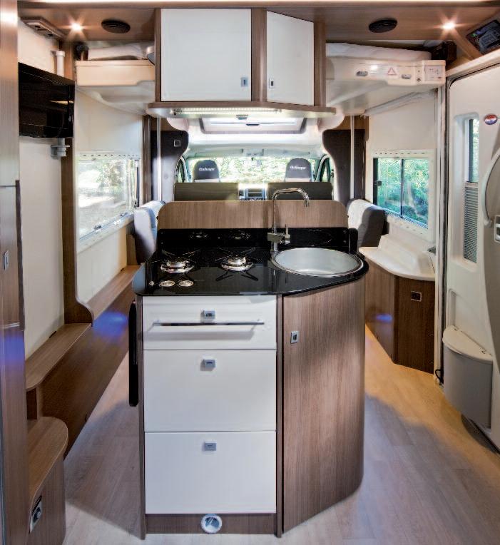 longues , to electronically move the seats to the relax position or to even convert them into a double bed Fold-away elements carry out the dual function of a seat and/or support surface The table features an electric telescopic leg and folding top, made of “soft touch” laminate, with anti-bacterial properties and extremely resistant to collisions and scratches The extremely comfortable pillows are made of polyurethane foam with low environmental impact, while the “eco-sustainable” fabrics are made using fibres from recycled material, which is in turn recyclable Thanks to the new remote-controlled electric pop-up roof, it is possible to set up the sleeping area while leaving the dinette untouched, thus increasing the habitability of both spaces Design and functionality are the distinguishing features of the kitchen This area features an extremely innovative design in terms of shapes, materials and technological solutions The Triaca kitchen is characterised by: large stowage capacity, electric induction hob that can be removed to be used outdoors (for a larger
