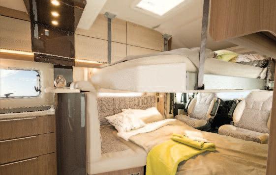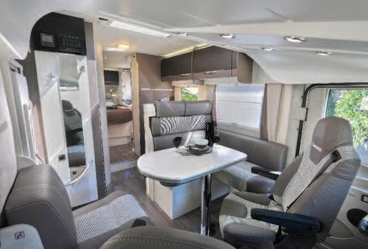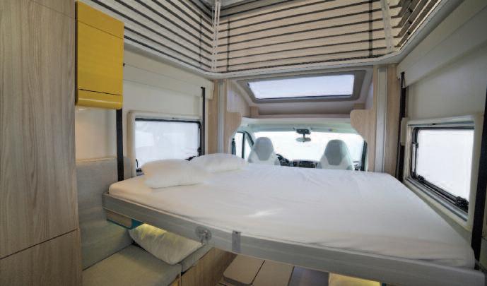 The applied technological solutions are known and commonly used in other manufacturing sectors Roller Team is applying them for the first time to motorhomes through the Triaca Concept, offering the ability to transform interior spaces through the use of electric or manual mechanisms On the left side of the Dinette, there is a relaxation-reading seat, equipped with an electrical remote control, and the fold-away bed, which is light and easy to position On the right side, the sofa can turn into a chaise longue thanks to the manual movement of part of the seat that, through a friction hinge connected to an aluminium frame, becomes a backrest and is completed by the electrical footrest movement A particular innovation is a lifting system for the roof above the Dinette The roof can be popped up by means of an electrical remote control to expand the habitability of the Dinette In addition, the large space created in height allows the positioning of an elevating bed, thus ensuring maximum habitability of both the day and night living quar-