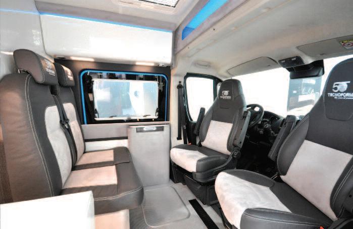 Tecnoform is the leader in interior fur niture for motorhomes and yachts and known for integrating top-end materials, design skills, efficient production and sophisticated logistics Over the past twenty years, Tecnoform has set the trends for recreational vehicle interiors in terms of style, technology and comfort and will be celebrating its 50th anniversary with Fiat Ducato 4x4 Expedition The interior design is characterised by clean lines, essential streamline fur niture and use of high-tech materials to create a lounge-like atmosphere for perfect relaxation at the end of an intense day outdoors In an ambiance where elegance meets practical construction solutions and use of top-end materials, technology plays an important role in integrating design ideas and conveying an overall feeling of cosiness and happiness inside For instance, Tecnoform has created a lighting system integrated in the fur niture units and a last-generation entertainment system with multiple speakers and two retractable flat screen TVs Sophisticated comfort gives way to functionality in travelling configuration The fur niture tops are provided with a sort of 'lid' which elegantly conceals the real destination of use of the units to enhance rational organisation and streamline shapes