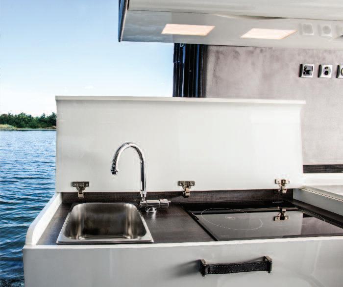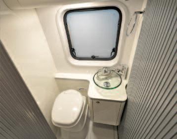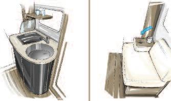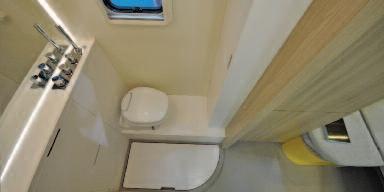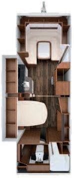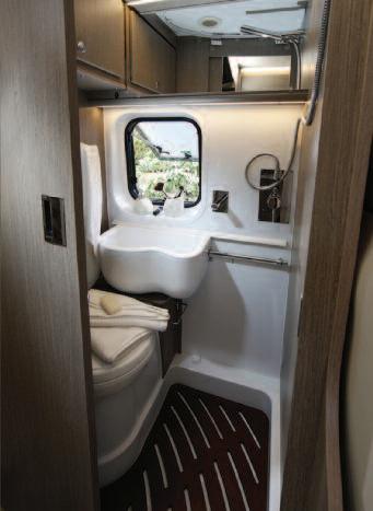 work surface), worktop and sink made of PRAL (anti-bacterial material) equipped with sink lids that can turn into dish racks/cutting boards and with an electronically-controlled mixer tap (with air mixing, that allows you to save 70% of water) The refrigerator consists of two distinct compressors that can also be used separately by means of the SEC (Smart Energy Control) system, for lower energy consumption The tight spaces of the bathroom underwent ergonomics studies in order to achieve maximum freedom of movement in less than 1 square metre The washbasin and fold-away modular containers, such as the shoe rack and a small cabinet that can be used to hang clothes or store other objects, make the most of the available space The innovative single-piece tap that separately controls the ceiling shower, the washbasin mixer tap and the independent shower head ensures, thanks to air mixing, significant savings in terms of water consumption (20%) Lastly, the minimal and modern design makes the motorhome very elegant and pleasant to use