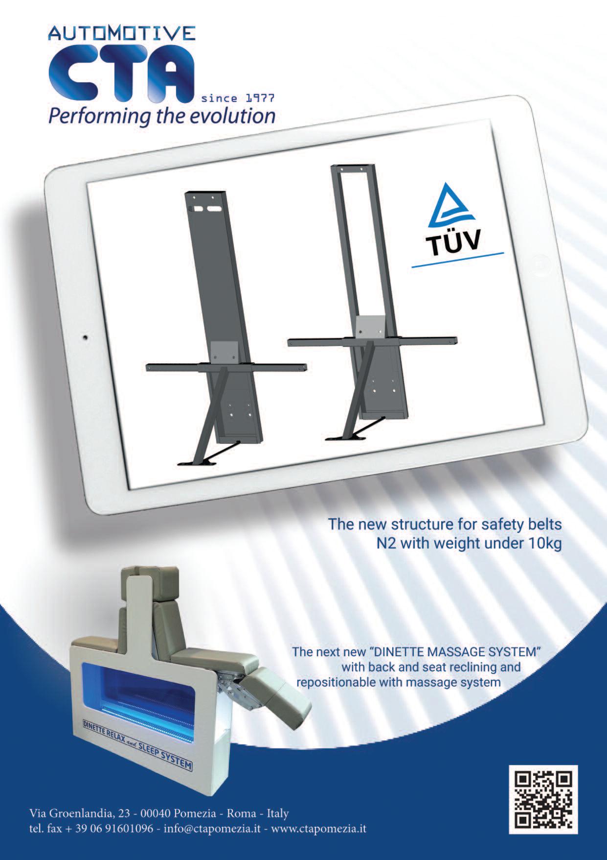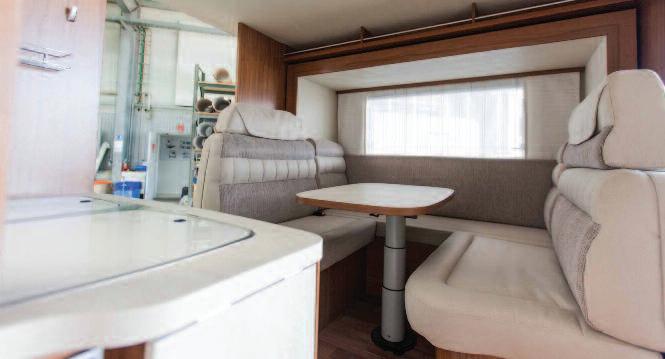 the shell is balanced by the lack of a proper table leg The shell has a thickness of just 140 mm, is realized in boxed aluminum and can be covered with the ennoblements used for the other details of the vehicle The table can get to important dimensions and is applicable on any type of R V, including caravans The version developed has two foldable portions that further enlarge the surface, creating a wide and easily enjoyable table “We have developed this table together with Tecnoform and are very satis f i e d w i t h t h i s p a r t n e r s h i p – c o n t i n u e s Davide Nardini – The possibility to free, with a single movement, the dinette from the obstruction of the table opens new scenarios in the research for space onboard When not needed, in fact, the table limits the habitability and represents an obstruction, both in movement and not This is clear to the British, that have the habit to remove the table and put it in the wardrobe Now, even them will have a more simple solution for this purpose»