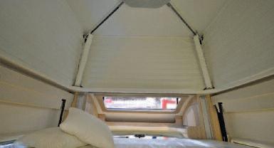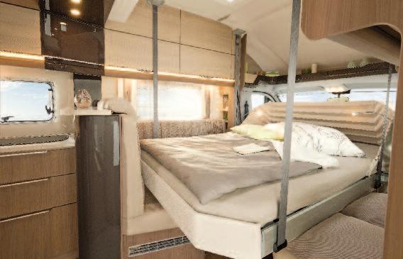 I n the low profile Dethleffs 4-travel, the pull-down bed realized by Project 2000 is positioned lengthwise and not across the way It can now be pulled down far enough so that everyone can get into bed as easily as in a fixed double bed The sleeping area of 200 x 140 cm is significantly bigger an any classical pull-down bed By dispening with another fixed bed, it is possible to create an inside space which is open and spacious and features a luxurious en suite bathroom across the entire width of the vehicle