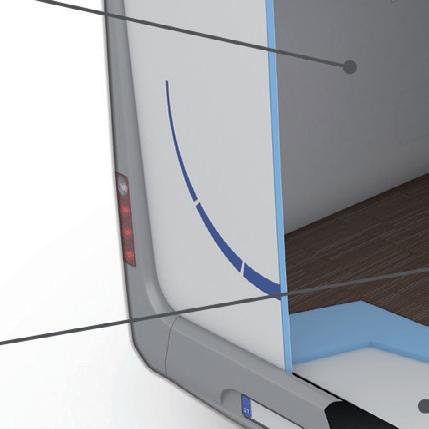 walls and the anti-hail fiberglass roof is completed by a special rail that allows the anchorage of any veranda and that, of course, constitutes an actual gutter for the underlying side panel. Different but equally valid is the system developed and introduced by Carthago in 2003 for Chic models and still successfully used on the lines currently produced by the German brand, which is characterized by the elegant curvature of the upper wall. The curvature, obtained by milling the RTM insulator, the wall folding and the inclusion, on the inner side, of a stiffening aluminum profile, further combined with an increase of the insulation layer thickness, directly encounters the flat surface of the roof. The roof edges are joined by a special rail, which is rigidly coupled to the extreme edge of the wall and under which the cover fiberglass sheet is placed. Thus, exactly as occurs for the wall / floor junction, the body can be assembled by embedding, without the use of carrier screws. A similar conception of wall / roof assembly has been adopted for years by LMC for different vehicles including the BreezerV low-profiles, Cruiser and the low-profiles Explorer, as well as for the models derived from the latter: Buerstner Aviano MY 2016 and the recent Hymer Classic, while in France, Rapido has chosen this type of construction for the Distinction flagship series.