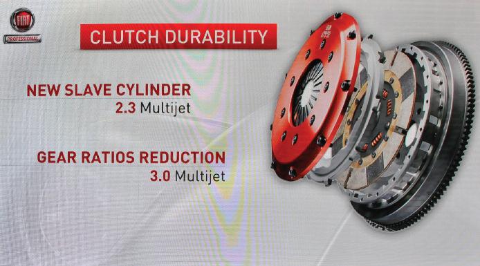 Working on materials and components, we managed to balance the weight increase caused by body reinforcements and to reduce the new Ducato kerb weight by up to 20 kilos on chassis cabs Moreover we developed an exclusive rear composite suspension option, that ensures an additional weight reduction of 15 kilos New Ducato is the only vehicle in its category to feature this specific suspension, designed for the motorhome mission Don’t forget that Ducato is made to carry 3 65 tons Then there are the larger campers, for which we can now offer a 4 4-ton version (and a total weight of 6 5 tons, including towing), now with the admittable weight on rear axle at 2,500 kilograms, useful forlong hoverhangs and garages We introduced extra reinforcements in key van body joints and door frames and improved door hinges, rollers, sealings and stoppers Then we developed a series of features offering important user benefits, especially as regards operating costs Brakes have been upgraded to reduce wear and tear, increase comfort and decrease noise by cutting brake-pedal force (thanks to a new pedal box) and upgrading performance and durability, thanks to new pads, disks and boosters and a new brake system for heavy motorhomes On front suspension we redesigned the top mount and added new seals to avoid infiltrations, reduce noise and (again) increase durability Also the durability of the clutch has been enhanced A new hydraulic actuator has been introduced on the 2 3 engine The gear ratio reduction on the 3-litre engine minimizes clutch effort and maximizes performance – with a particular focus on heavy use We keep on using dedicated gearbox ratio fitting with the motorhome usage The 16" wheels are now available on the standard Ducato range, also in alloy with new design