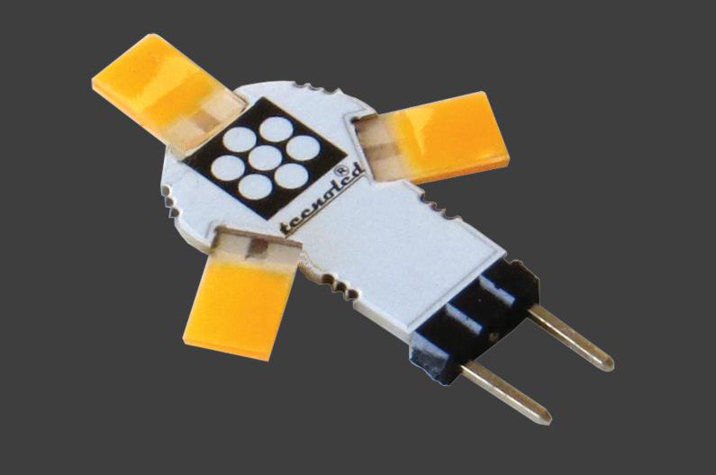 Traditional G4 modules render the mirror dish on halogen spotlights unnecessary, because the LED’s emission is only face-on and, in any case, the support covers the underlying dish The new technology proposed by Tecnoled makes use of doubleface suspended LEDs that produce a much more uniform light beam When lit, these LEds are no longer perceived as distinct elements, but rather as a single light source Even for the G4 line, where it appeared there was nothing more to say, Tecnoled has managed to innovate once again