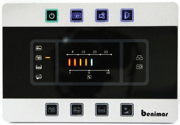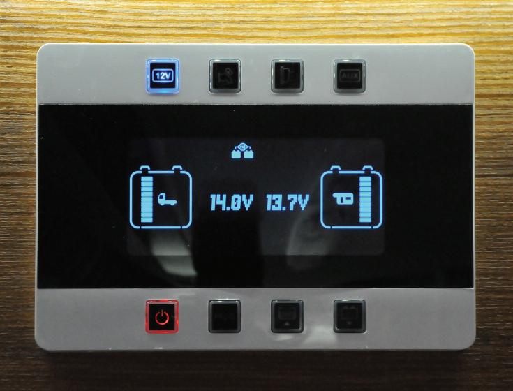 the older panels): it is a single unit, assembled by means of two springs in a hole bored into the plywood This allows for a simpler and quicker installation for builders An interesting implementation on this panel (which is sold at around triple the price of the PC180) is the possibility of interfacing with the software via a USB port on the mother board This allows for easy software upgrades, as well as the customization of alarms by changing the trigger thresholds The PC380 is of course also designed to replace previous generation panels without requiring any components of the existing installation to be changed The new panel features the following primary functions: graphic type and Volt control for the status of the car battery and battery services; service battery current charging and discharging control; a percentage control chart and graphics for the status of the fresh water tank and grey water; management of 3-way refrigerator functions; electronic integrated battery separator; car battery recharging; under-voltage control (“save battery” function); digital c