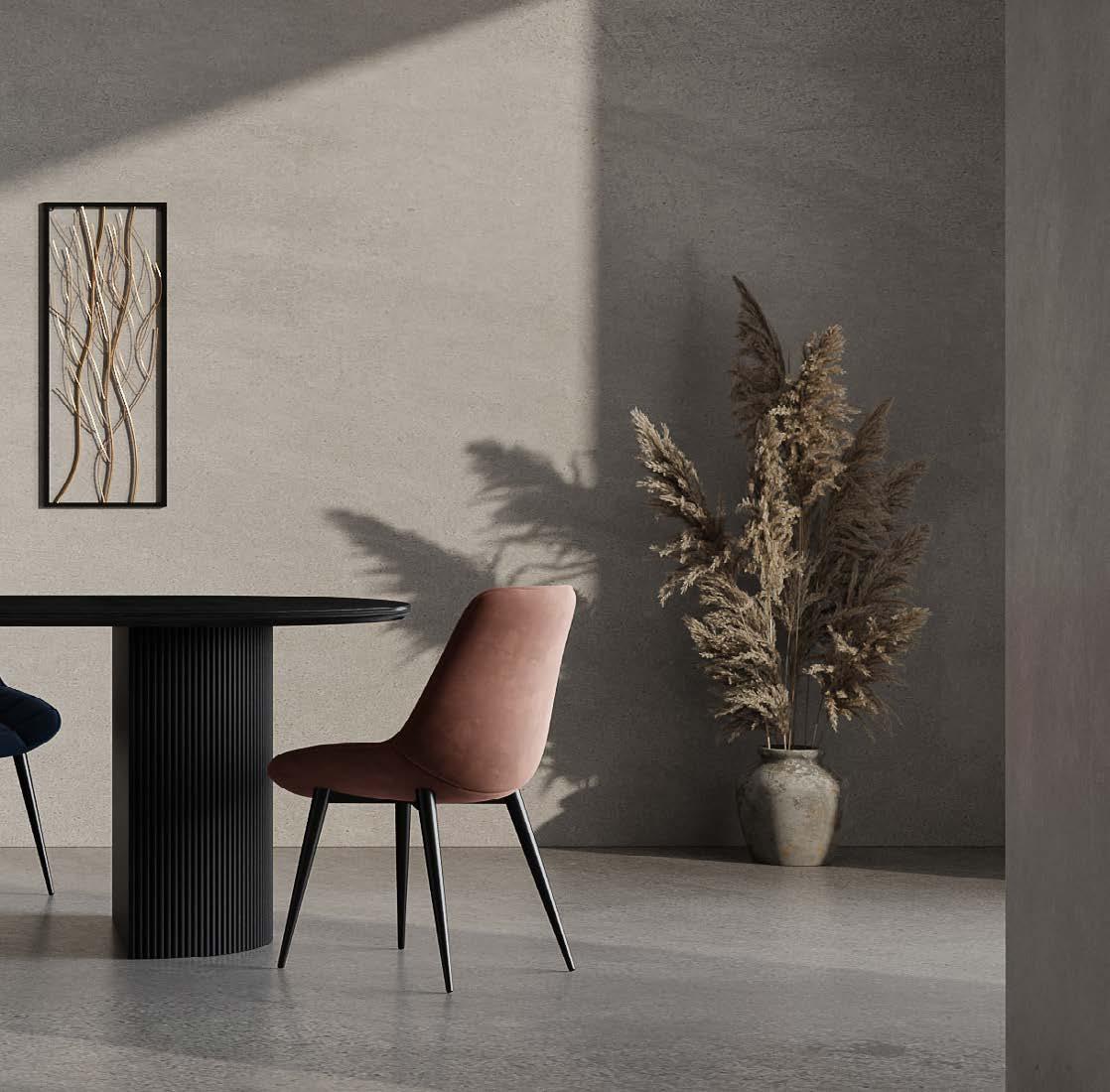 Stellen Sie sich ‘Samtige Harmonie’ vor, ein Designkonzept, das Opulenz nahtlos mit Stärke verbindet. Weiche Lisboa Samtesszimmerstühle in lebendigen Rosa- und Blautönen durchfluten den Raum mit Positivität und Wärme.