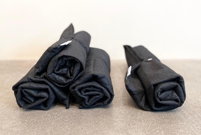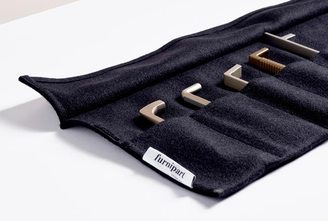 Textile pouches with Furnipart logo - To be used by sales reps when presenting furnipart handles, or to be used in showrooms for client presentations. These pouches have 10 pockets, are flexible and they are available in two sizes to ensure they can fit all size handles.