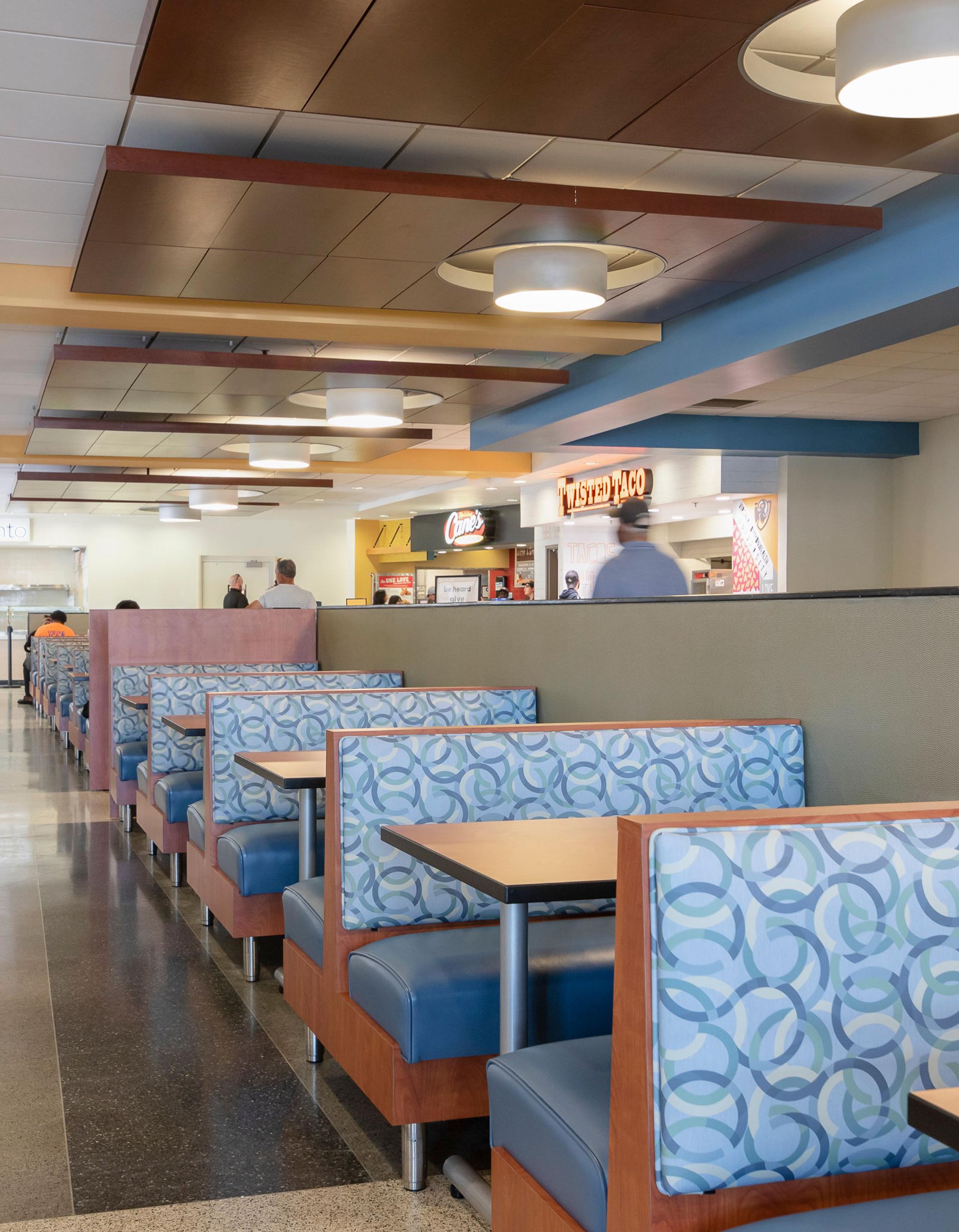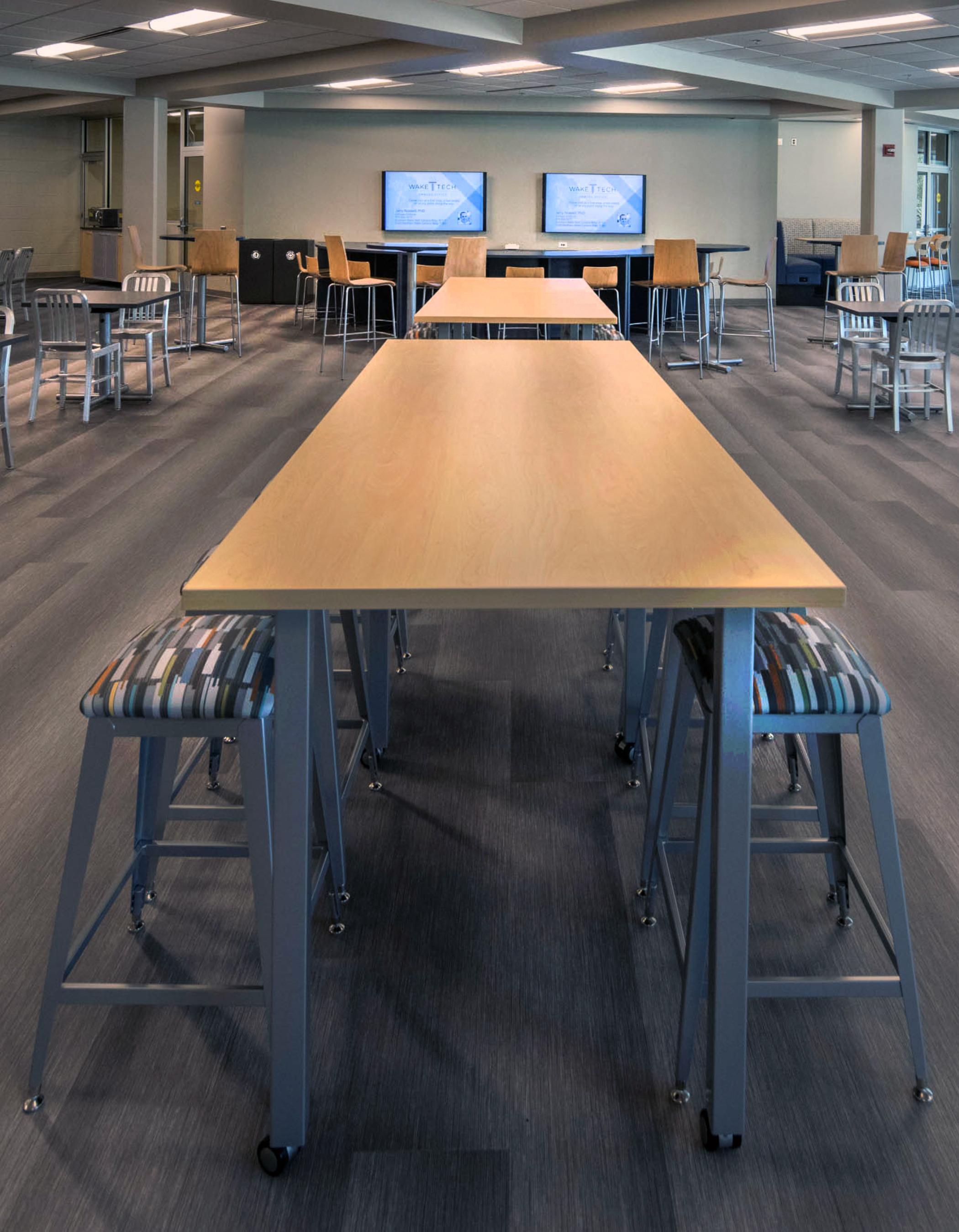 Oneofourfavoritedesignerswas taskedwithrenovatingadated spaceatWakeTech.They deliveredamodern,bright,airy studentlounge.Welovethe excitingmixofseatingatevery height,andthemultiplezonesfor eating,studying,andsocializing.