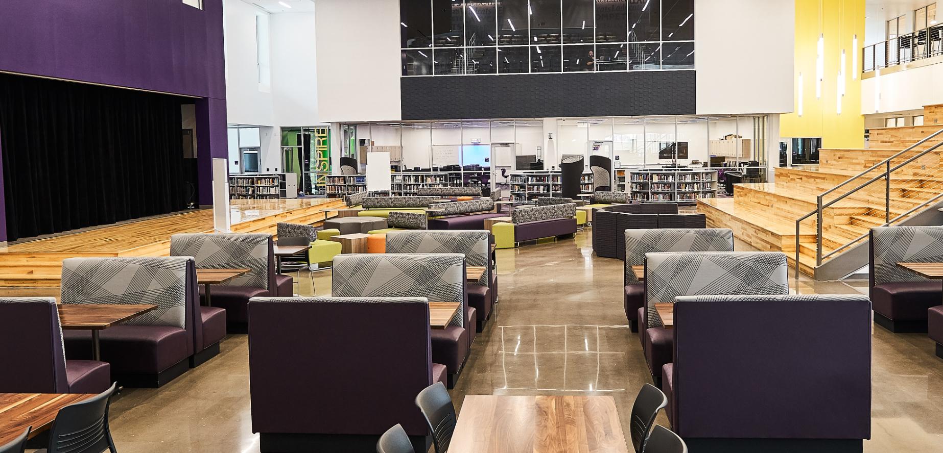 Districtsacrossthecountryaremakingdowithless—especiallywhenitcomesto squarefootage.Commonareasoftenneedtoperformdoubleortripleduty.Asa result,weareseeingsomanycafeteriasthatarealsoauditoriums(perhapseven withlibraryseating!)liketheonebelow.