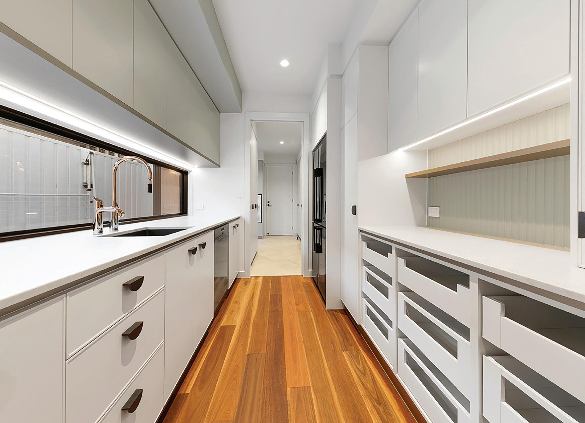 In the butler’s pantry, a suite of drawers provides generous, efficient storage. Their smooth operation and streamlined design ensure the space remains highly organised and functional for daily use.