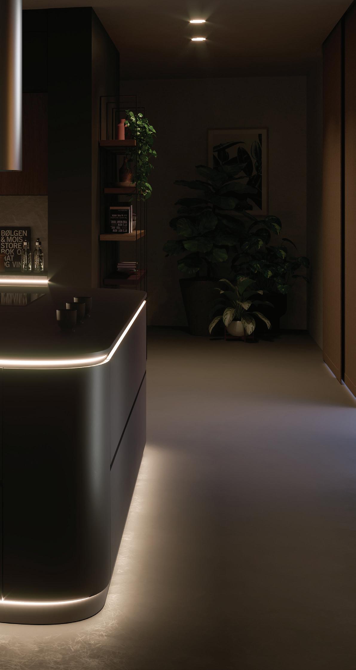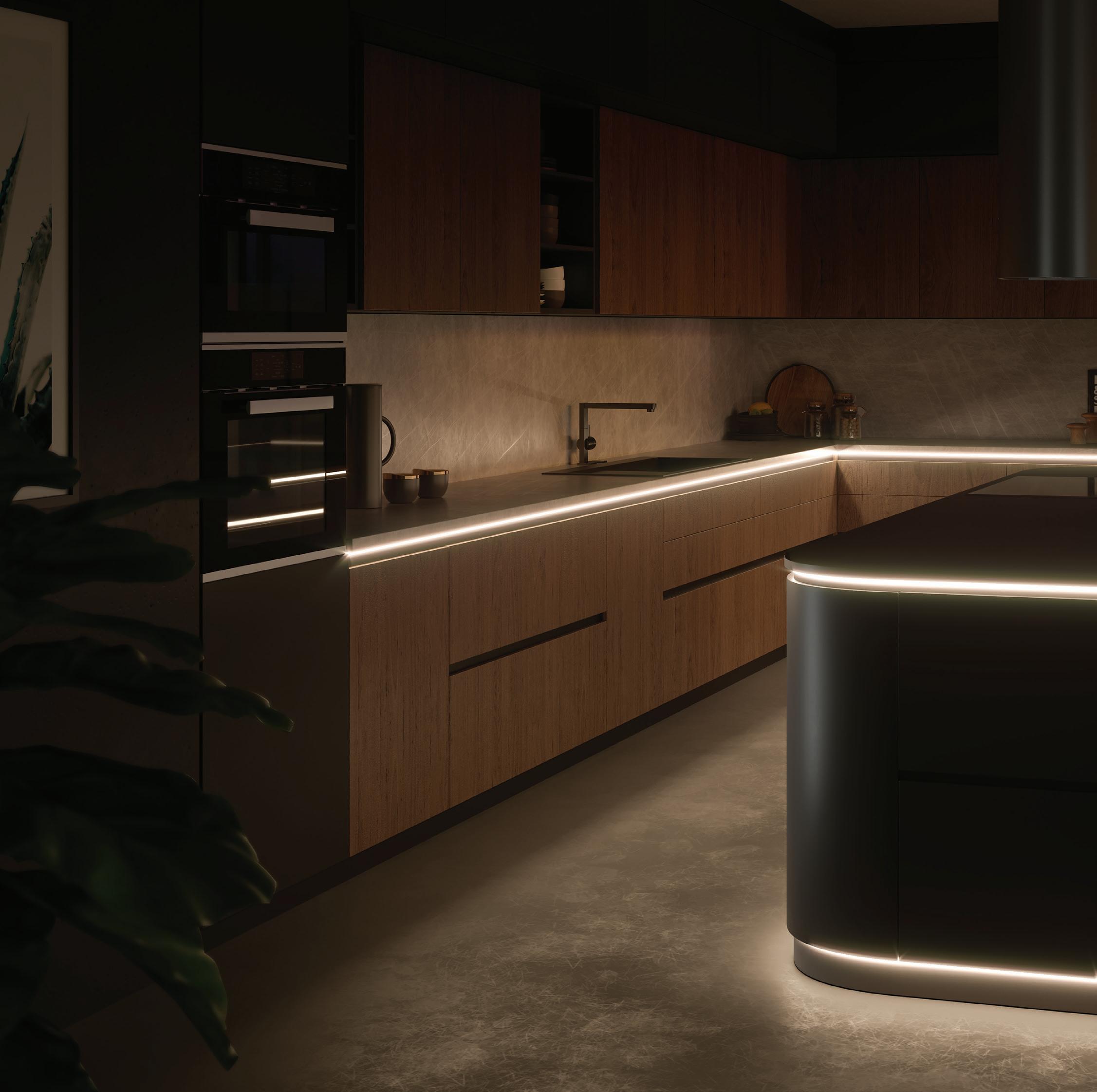 Timber accents in the mudroom further reinforce the consistent material palette, perfectly complementing the matching handles. Flexible strip lighting enhances both function and atmosphere, offering practical illumination while highlighting the natural textures and finishes.