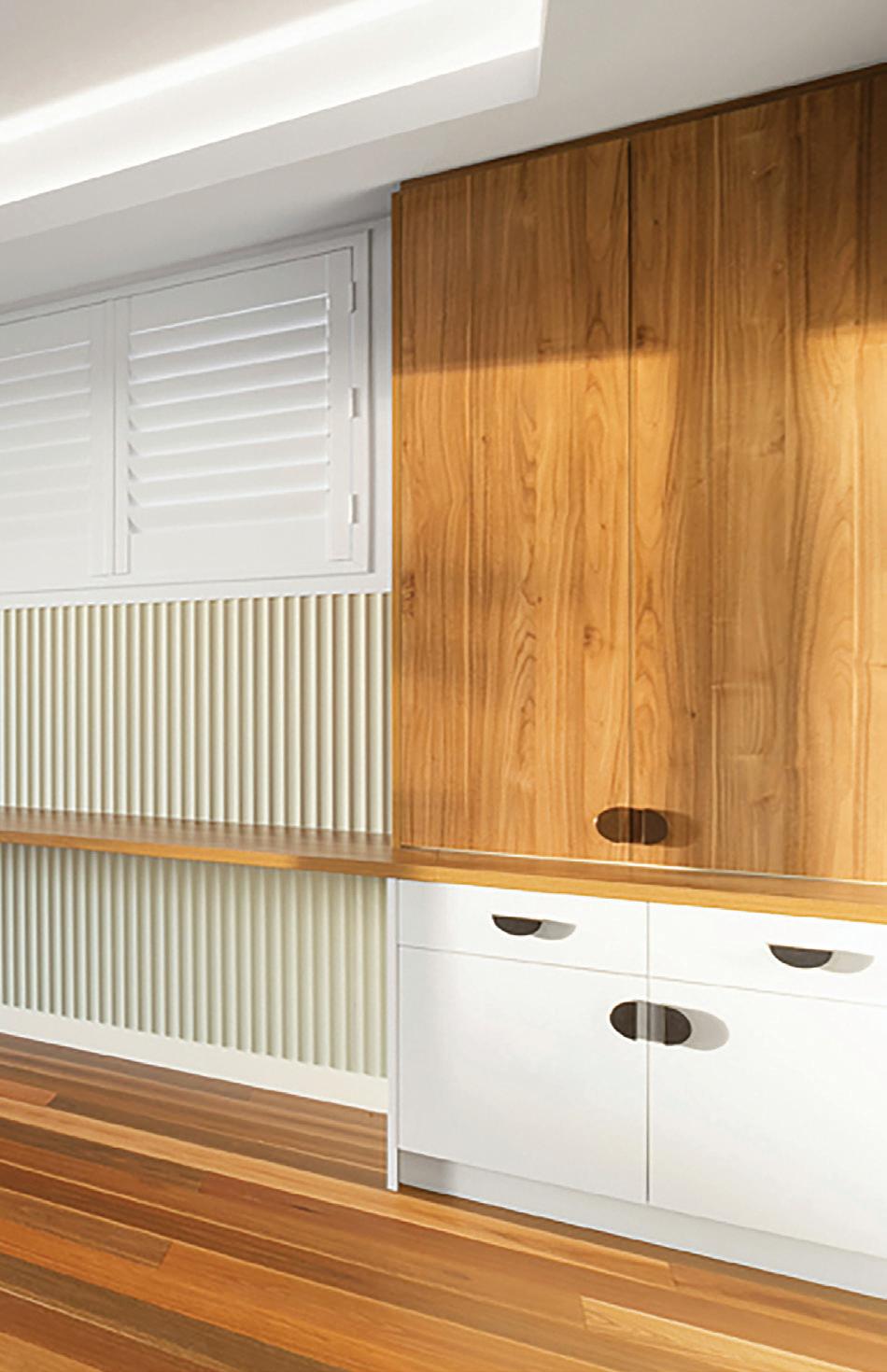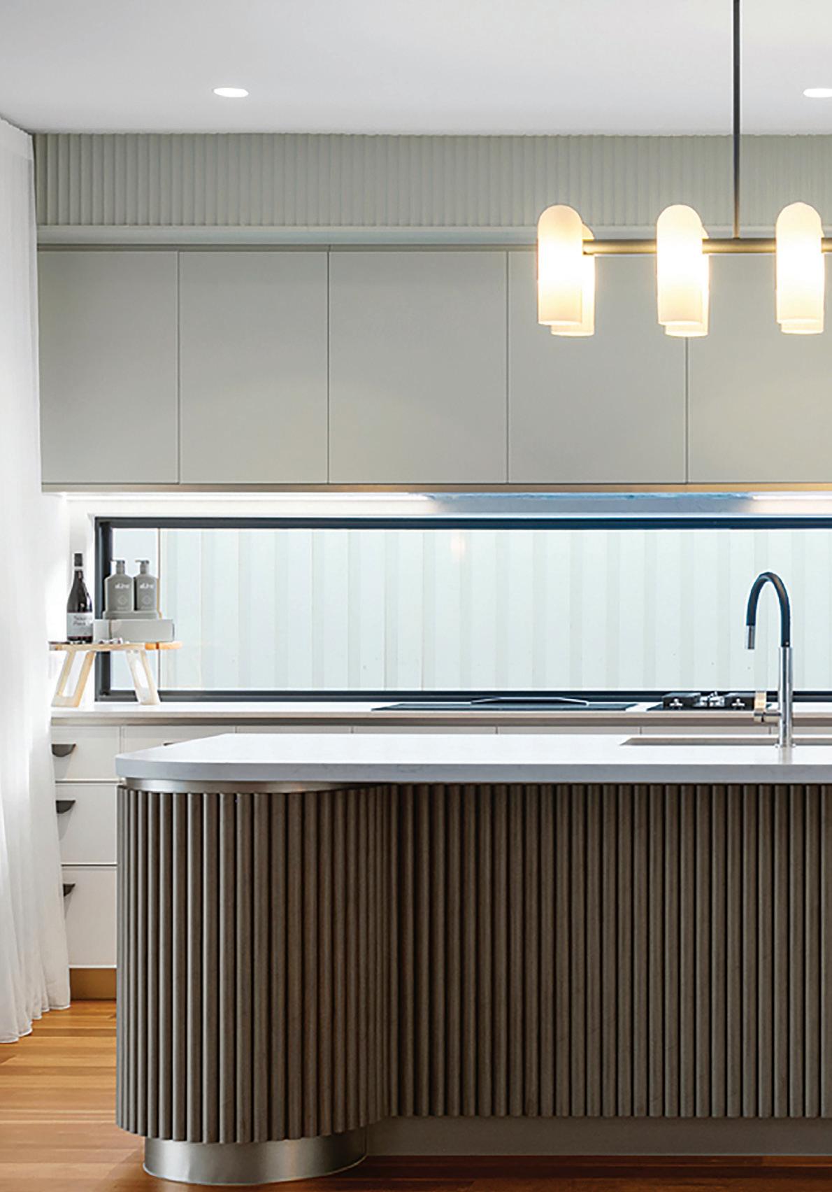 The kitchen highlights Momo Handles’ Ribbed Barrington Eclipse in Bronze, a design detail thoughtfully repeated throughout the home for visual consistency. The warm bronze finish complements the timber tones and natural materials, while the ribbed texture adds subtle depth that echoes other textured elements in the space. This practical yet stylish choice ties the overall design together.