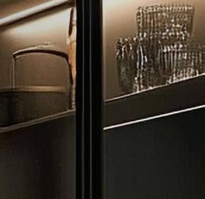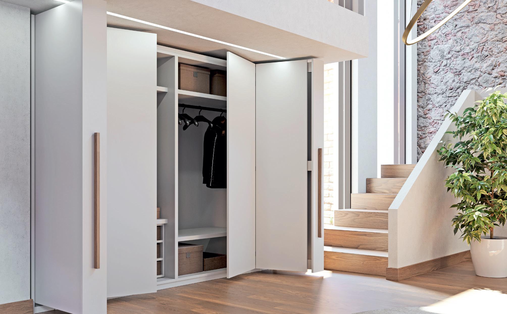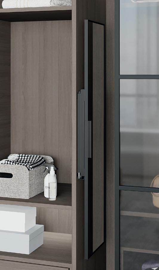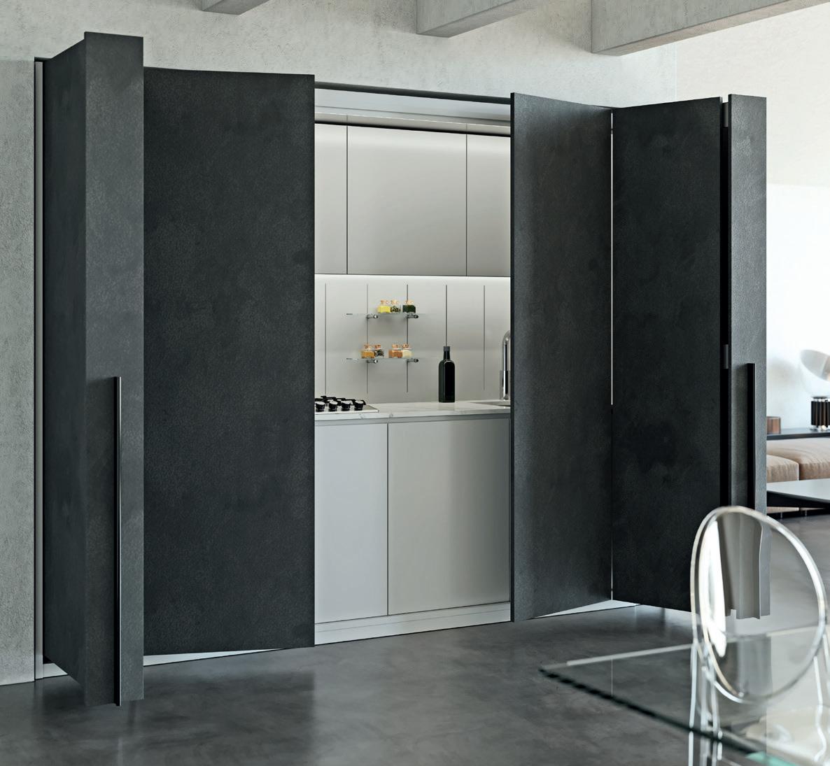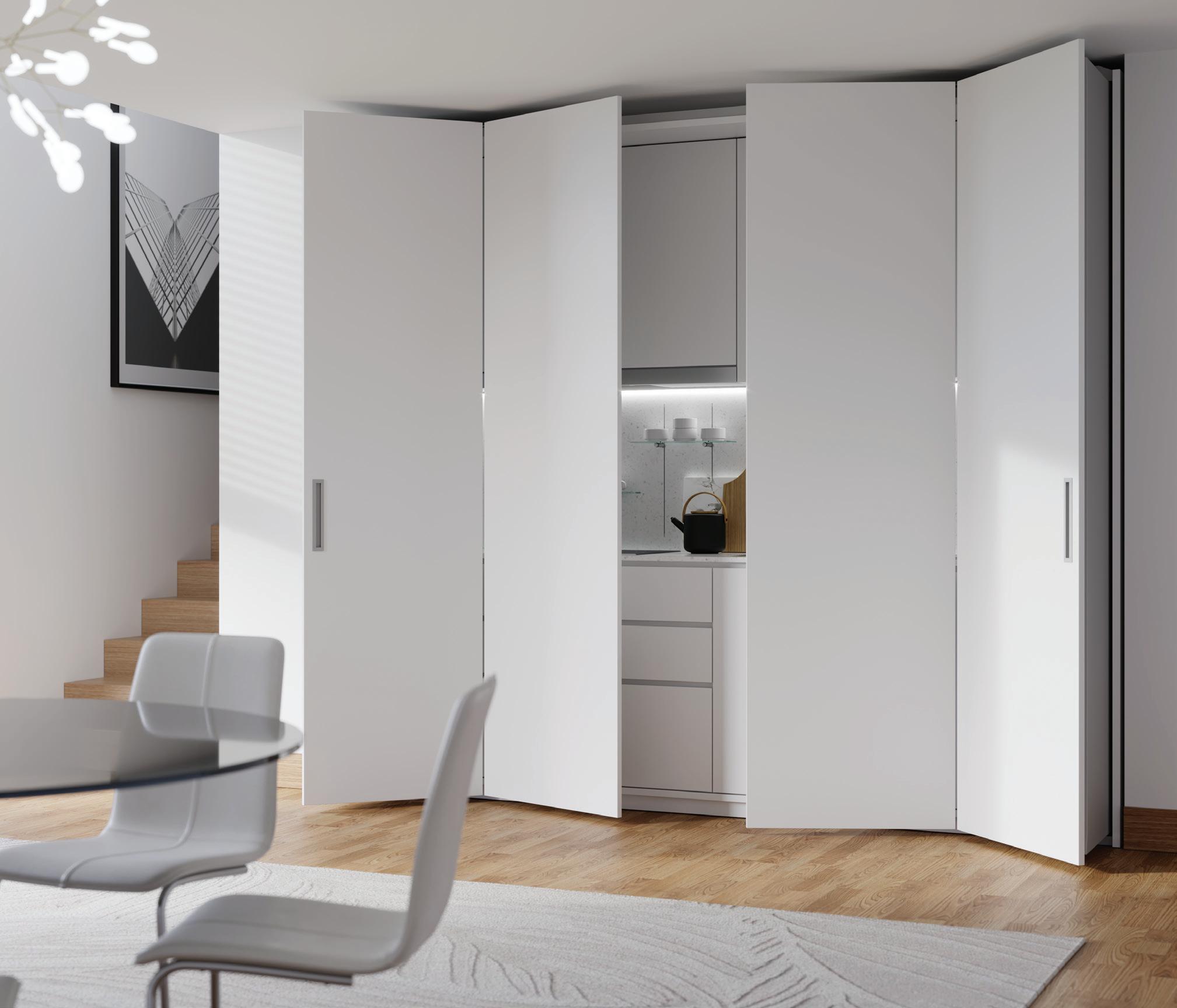 Able to be used as a single unit, paired in conjunction with single Exedra door, or as a double unit pair, Exedra2 Smart, allows door panel sizes to be consistent and equal across the installation. With free unobstructed access available for widths up to 2977mm the Exedra2 Smart is the perfect choice for elegant concealment of wardrobes, kitchens, pantries, office areas, butlers’ pantries, and a host of other applications.