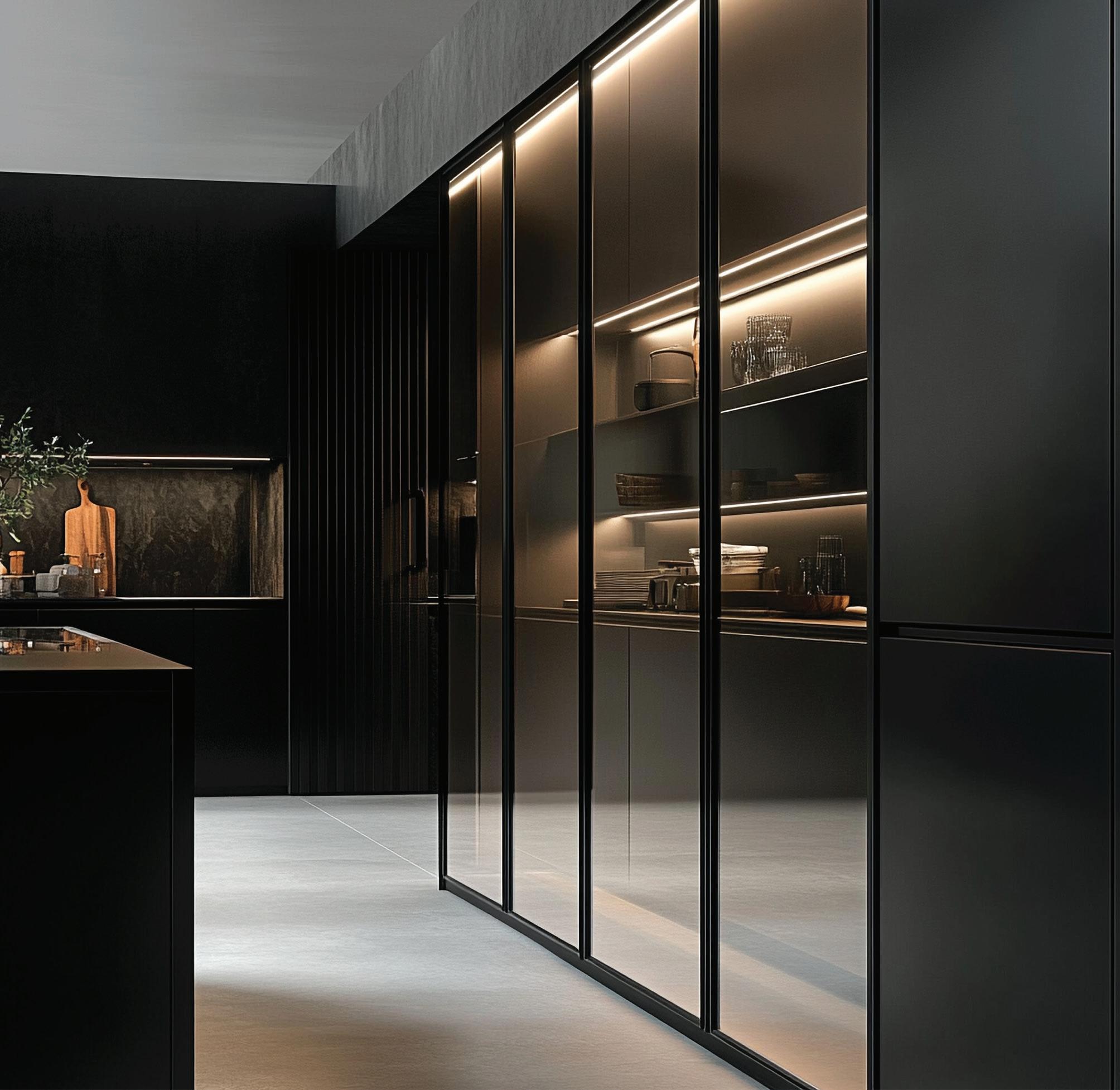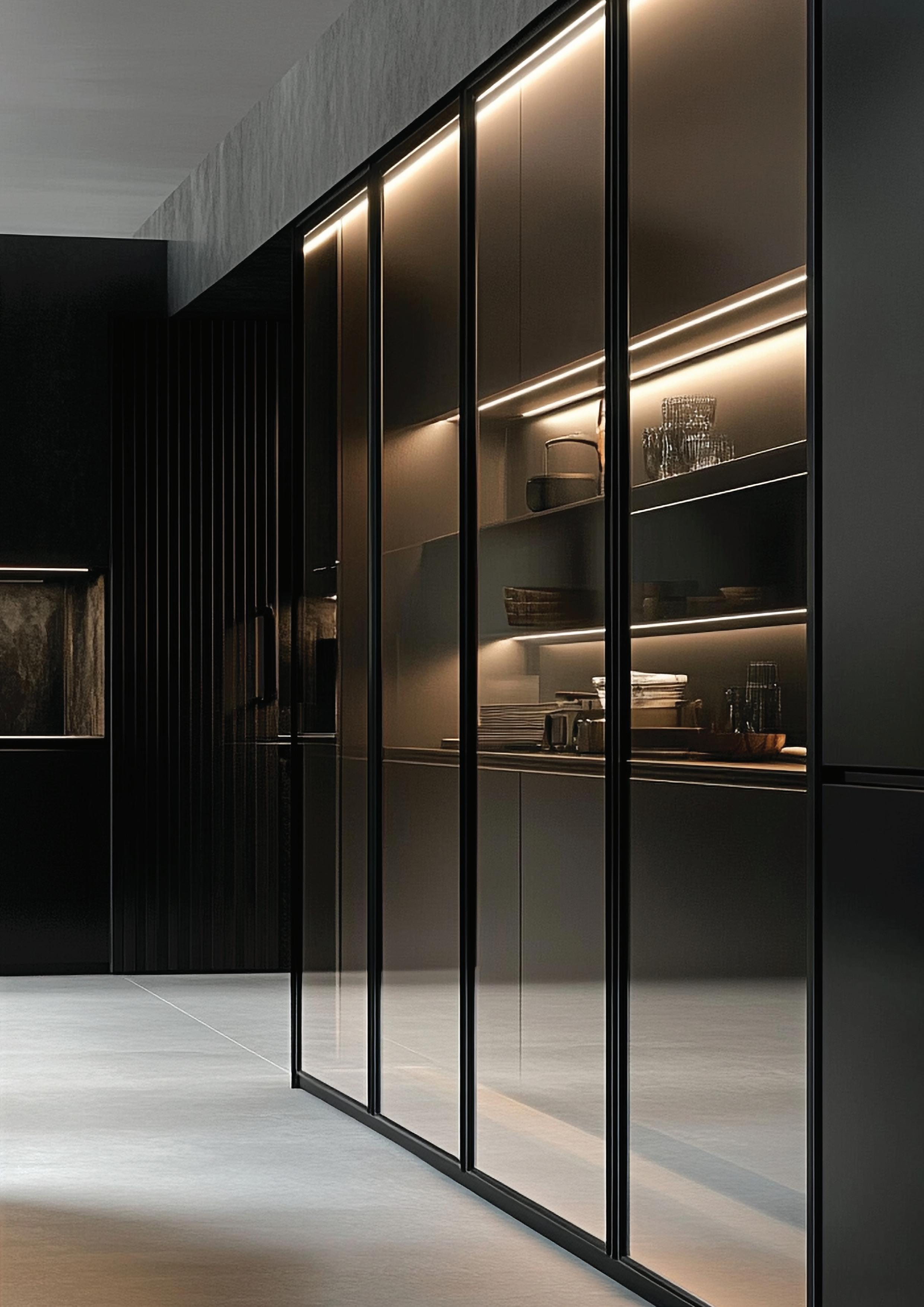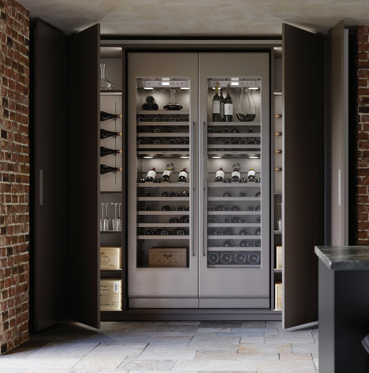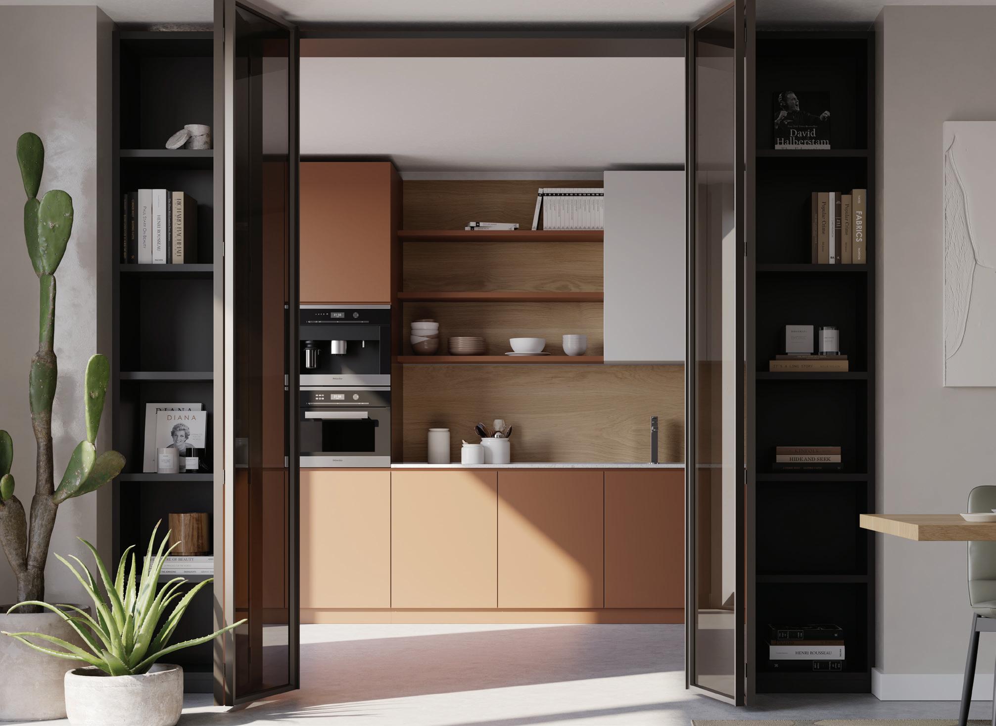 Able to be used as a single unit, paired in conjunction with single Exedra door, or as a double unit pair, Exedra2 Smart, allows door panel sizes to be consistent and equal across the installation. With free unobstructed access available for widths up to 2977mm the Exedra2 Smart is the perfect choice for elegant concealment of wardrobes, kitchens, pantries, office areas, butlers’ pantries, and a host of other applications.
