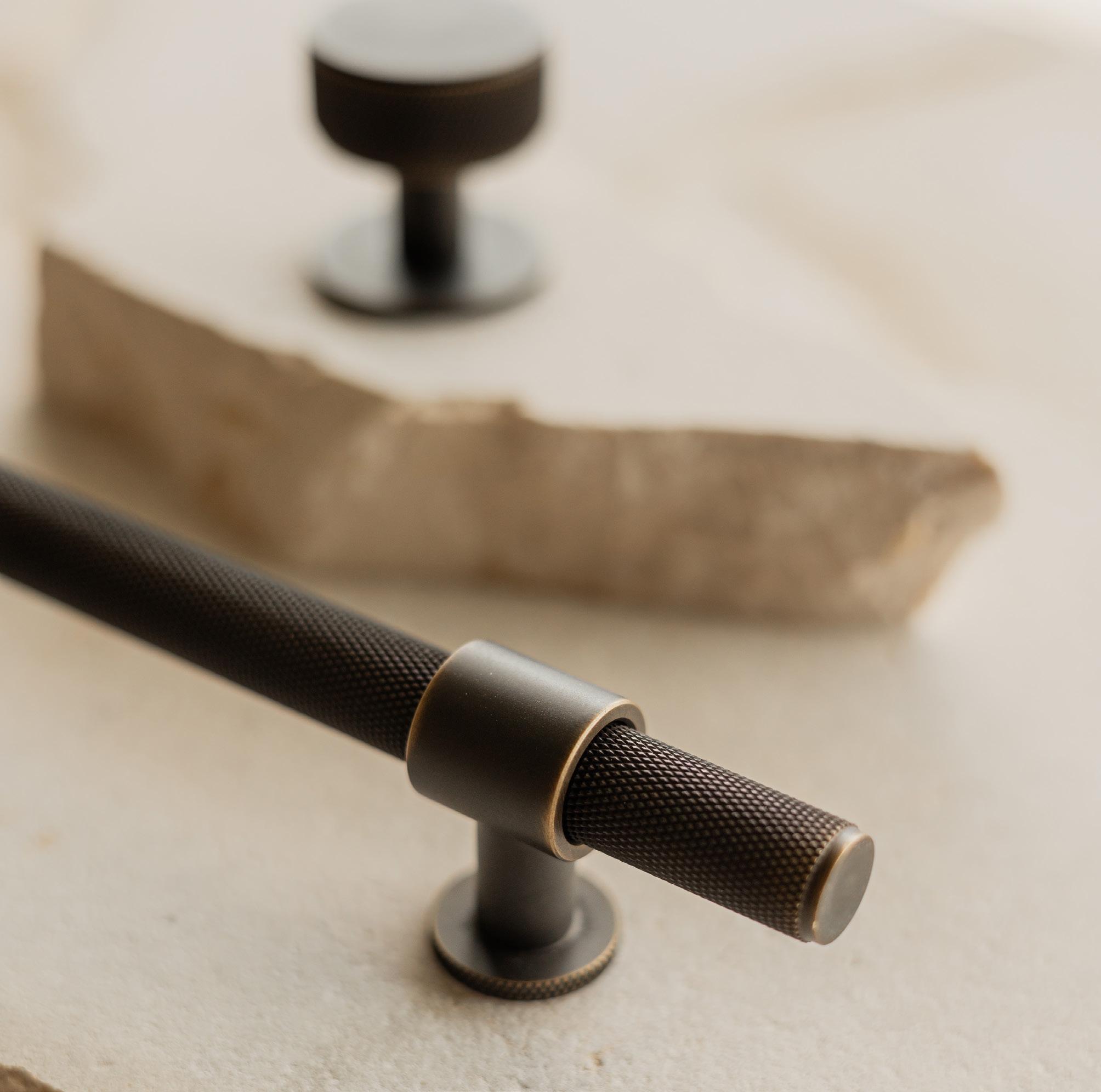 Dark bronze is available across our knurled range of both Belgravia and Bellevue in both cabinet handles and door hardware. Dark bronze offers the flexibility to create a beautifully cohesive look throughout your interiors.