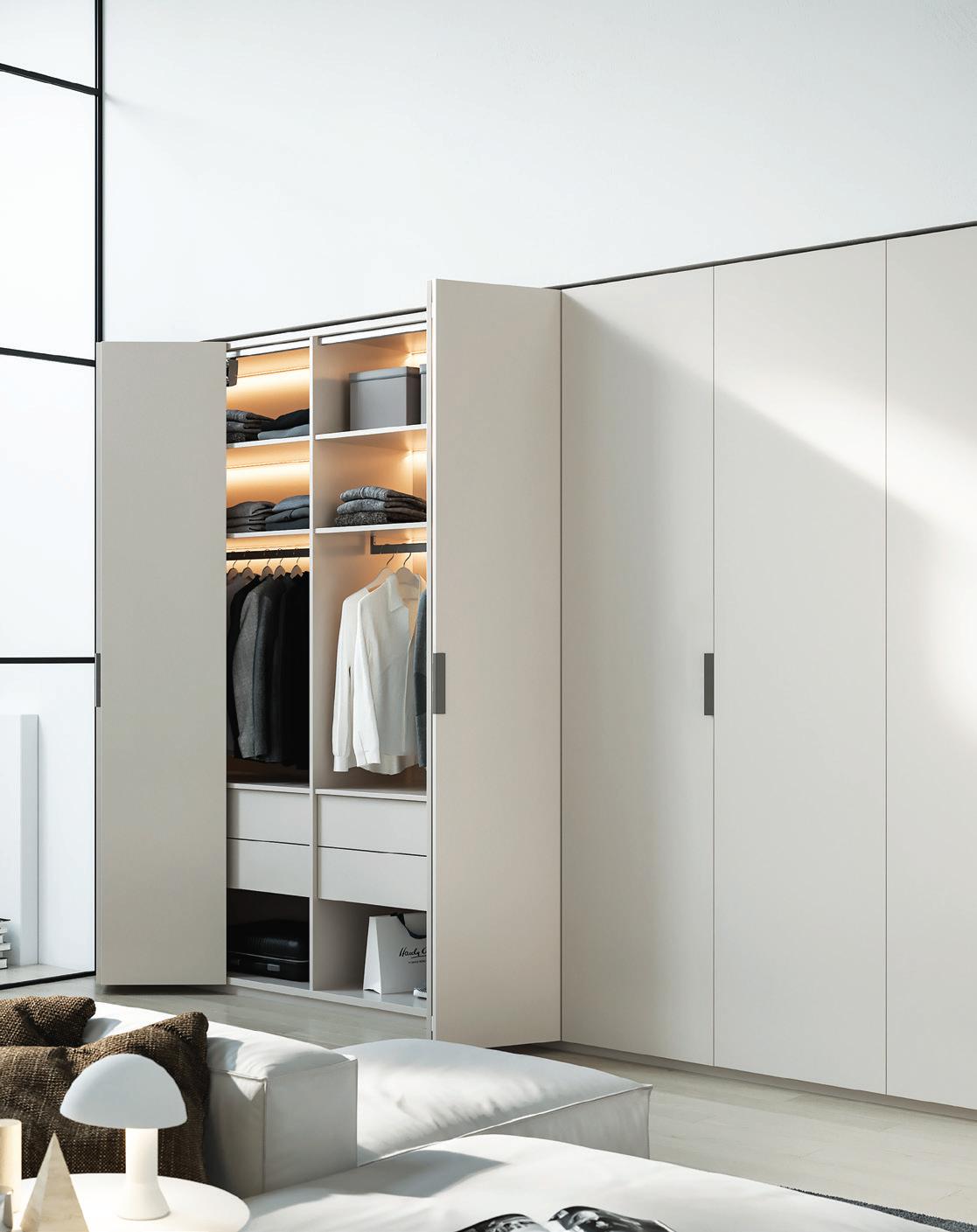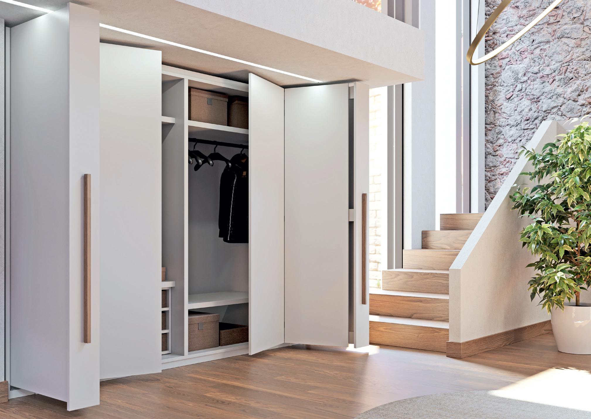 Exedra2 Smart, allows door panel sizes to be consistent and equal across the installation. With free unobstructed access available for widths up to 2977mm the Exedra2 Smart is the perfect choice for elegant concealment of wardrobes, kitchens, pantries, office areas, butlers’ pantries, and a host of other applications.