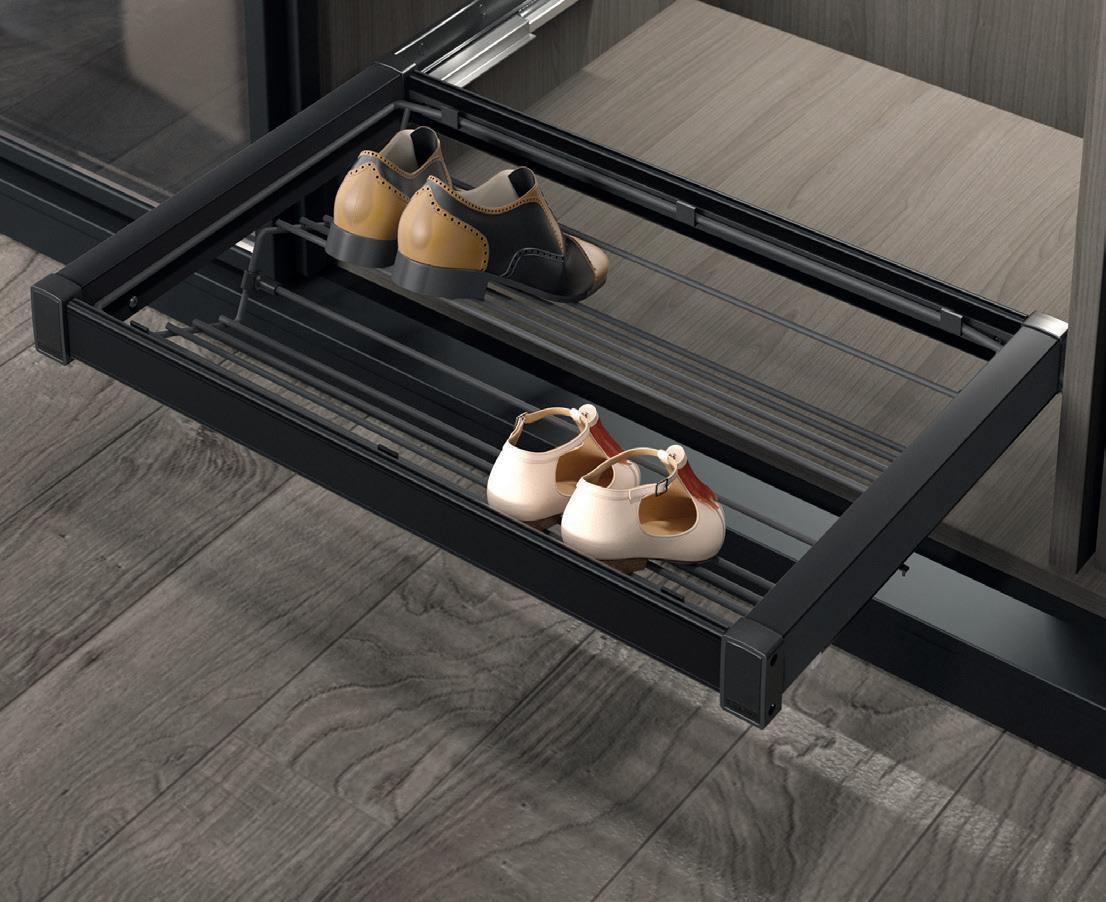 Storg Riki pull-out shoe drawer comprises an aluminium frame with a steel rack that holds 2 rows of shoes.