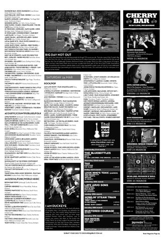 8:30pm. $12. IN MOTIONS + EVENT HORIZON + OF STOLEN MOMENTS Pony, Melbourne. 9:30pm. INTENTIONS (7â&#x20AC;? LAUNCH) + CARBS + INFINITE VOID + LITTLE KILLING Gasometer Hotel, Collingwood. 8:00pm. JUDGE PINO & THE RULING MOTIONS Bar Open, Fitzroy. 10:00pm. LATE ARVO SONS + BAD ACHES + BITS OF SHIT + SOMA COMA Old Bar, Fitzroy. 8:30pm. $10. LIKE IT LOUD - FEAT: OCEAN GROVE + EVER REST Club Shoop, Dandenong. 8:30pm. $10. MASA Thornbury Theatre, Thornbury. 7:00pm. MIDI WIDOW (SINGLE LAUNCH) + ADMIRAL ACKBARâ&#x20AC;&#x2122;S DISHONOURABLE DISCHARGE + KIDS REPUTATION First Floor, Fitzroy. 8:00pm. $10. MINDSET + BACKLASH + DECLARATION + LANDSHARK Gasometer Hotel, Collingwood. 8:30pm. $10. MINDSET + BATEMAN + DECLARATION + SAFE HANDS + TERM FOUR Yah Yahâ&#x20AC;&#x2122;s, Fitzroy. 9:00pm. $10. MYRTLE PLACE + FISTY CUFFS + STRAWBERRY FIST CAKE + THE HALF PINTS + WHEREâ&#x20AC;&#x2122;S GROVER?
