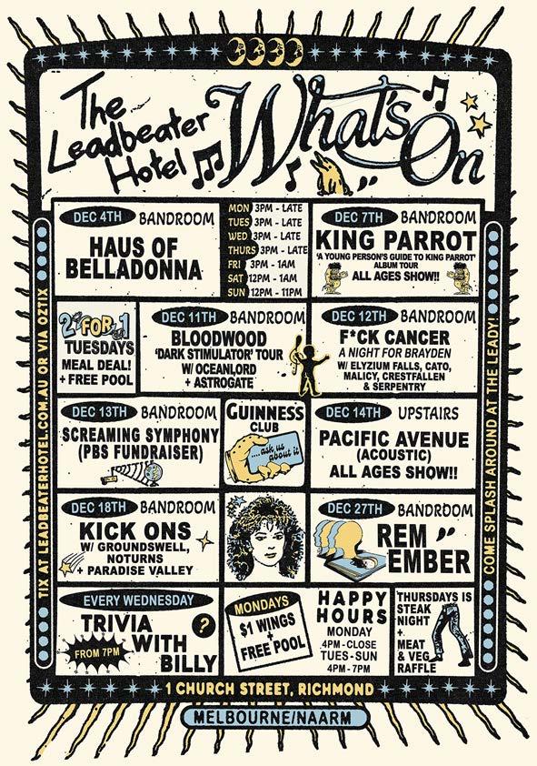 11/12 MAD VANTAGE 12/12 CORDRAZINE w ALEX LLOYD SELLING FAST 13/12 BIIG TIME 14/12 CARUS THOMPSON (MATINEE)