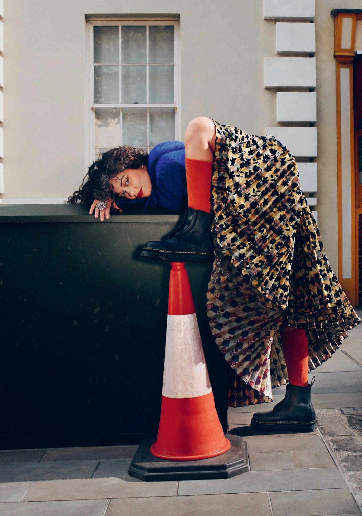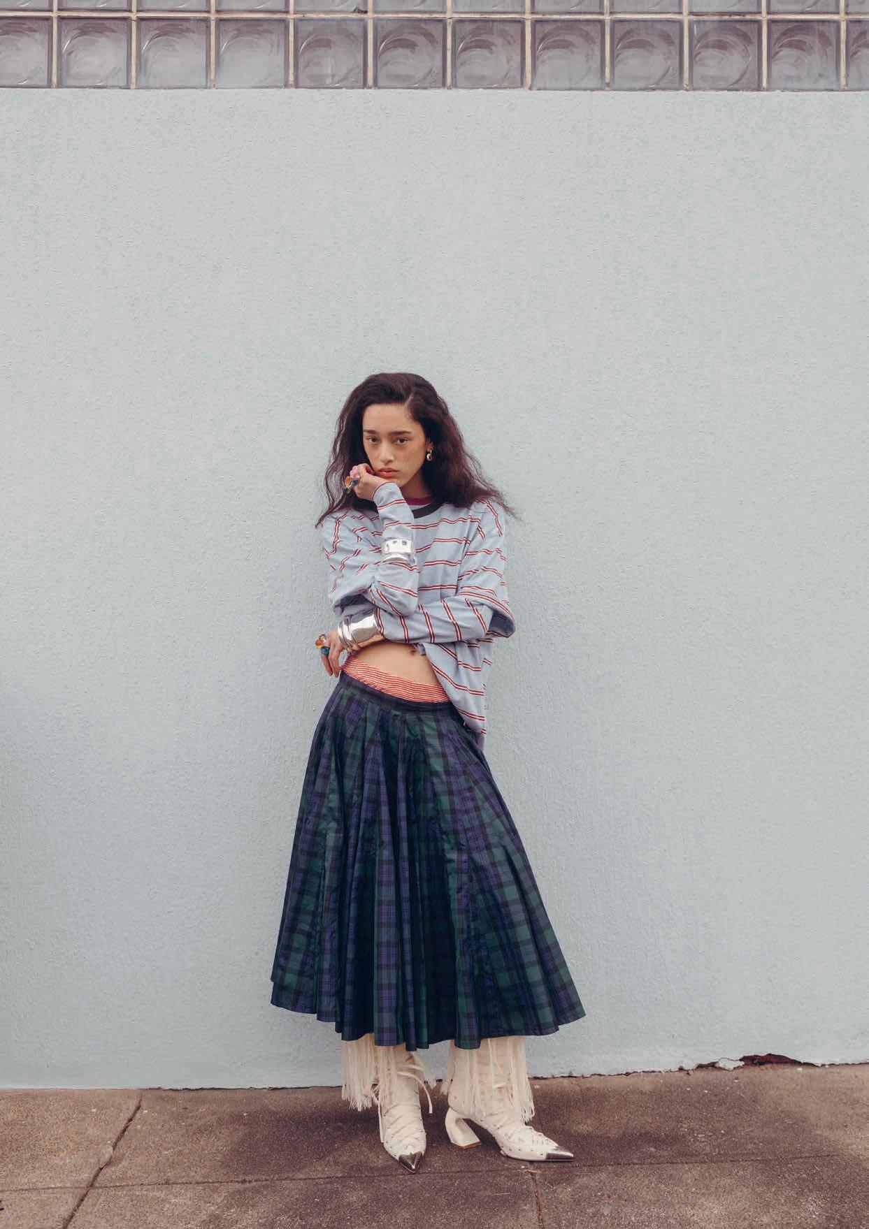 Zara wears IORDANES SPYRIDON GOGOS X BILLIE RONIS dress, ROMANCE WAS BORN shirt, MAISON ESSENTIELE skirt (worn as headscarf), HEAVEN BY MARC JACOBS necklace from P.A.M. STORE
