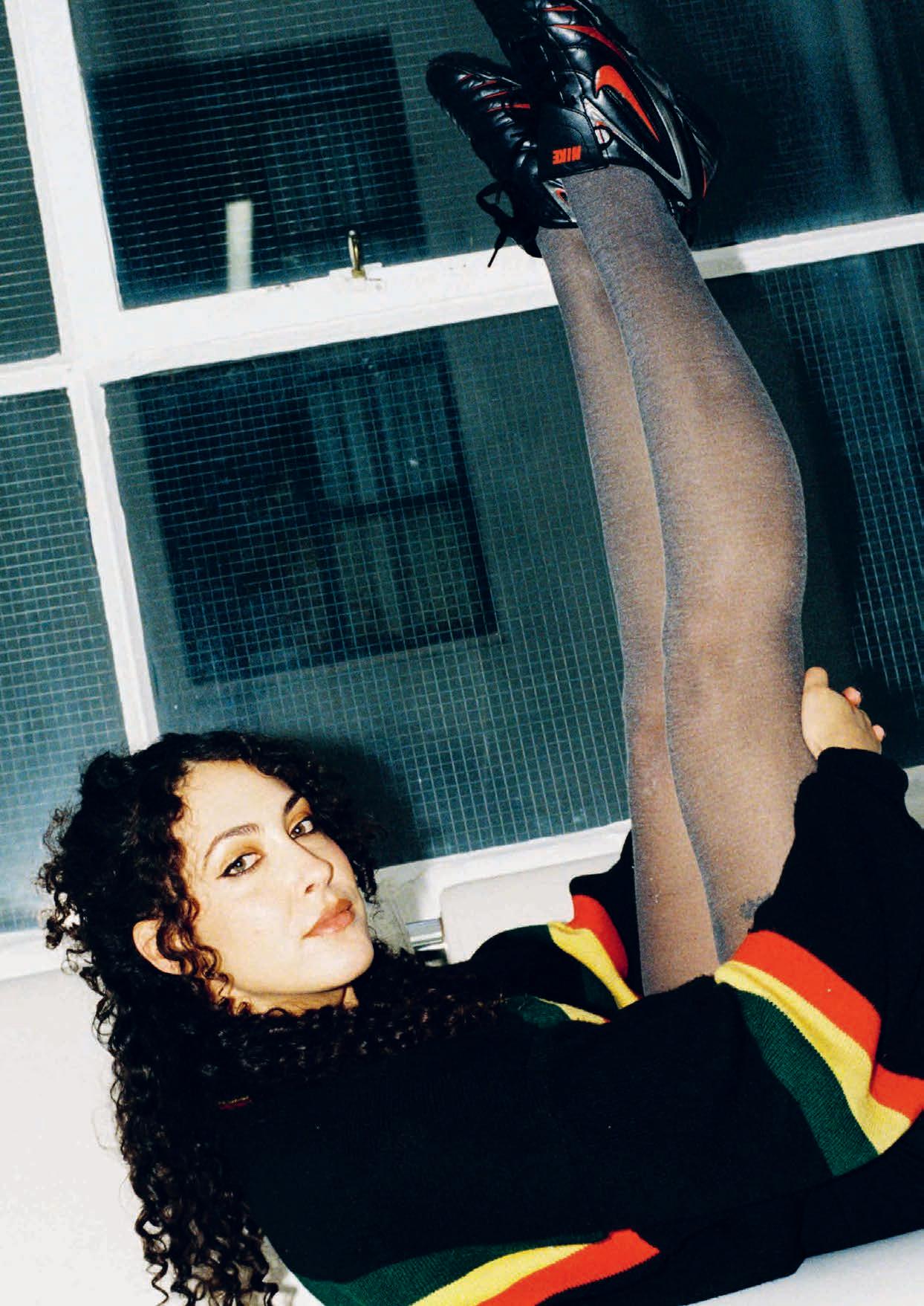 MALA WEARS KARLAIDLAW top and bag, CANDY’S LINGERIE tights, TONY BIANCO shoes