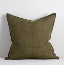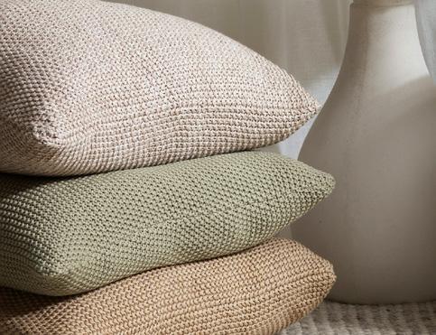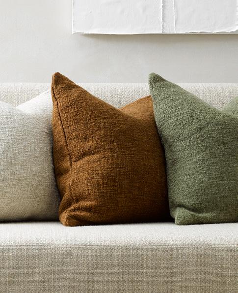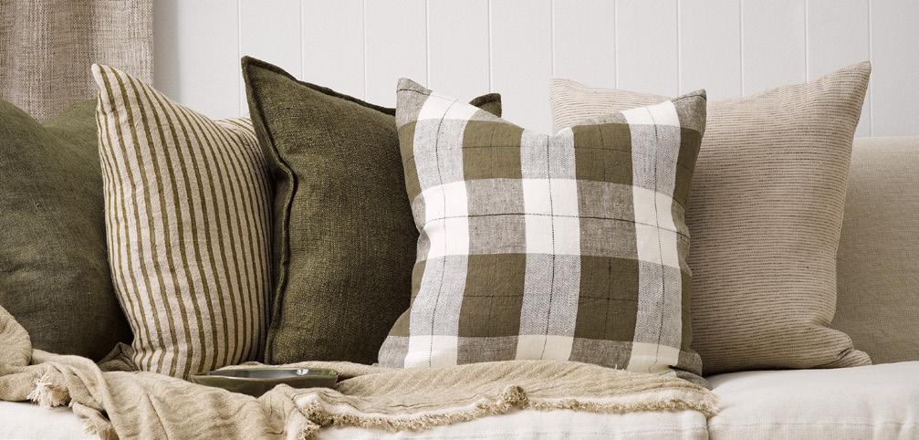 PICTURED Bromley Thyme and Amelie cushions, Altona Mangrove throw.Create spaces that revive and renew through the power of simple designs, handcrafted details, and natural fibres.