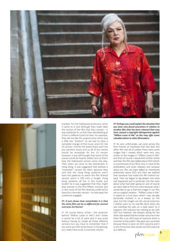 markets. For the Hollywood producers- when it came to it and although they really liked the version of the film that they viewed – it was explained to us that they werelooking at it from a different point of view. For example, they did not like the original score which was a little too “Eastern” so we had to have a complete change of the music score for the US version. And for the States there won’t be any sensitive issues and so all of the scenes should be accessible for the US version however, it was still thought that some of the scenes could be heavily edited and so that’s how the Hollywood version came into play. Then when we came to the distribution in Hong Kong, it was suggested that wehave a “cinematic” version for them because they said that the Hong Kong audience won’t have the patience to watch the film festival version which is 109 mins in length. Hong Kong residents all live in this hustle and bustle! So it was suggested that they might lose interest in the first fifteen minutes and in fact most of the film festivals preferred to have this cinematic version – to help keep the audiences engaged. FF: It just shows how remarkable it is that the same film can be so different for several overseas territories! JY: Of course Kenny (Chan - the producer behind “Million Loves In Me”) and I knew it would be a lot of work and it was quite tedious having to create all these different versions but you have to remember that if you want your film to be shown in Hong Kong, you really have to do a cinematic version.