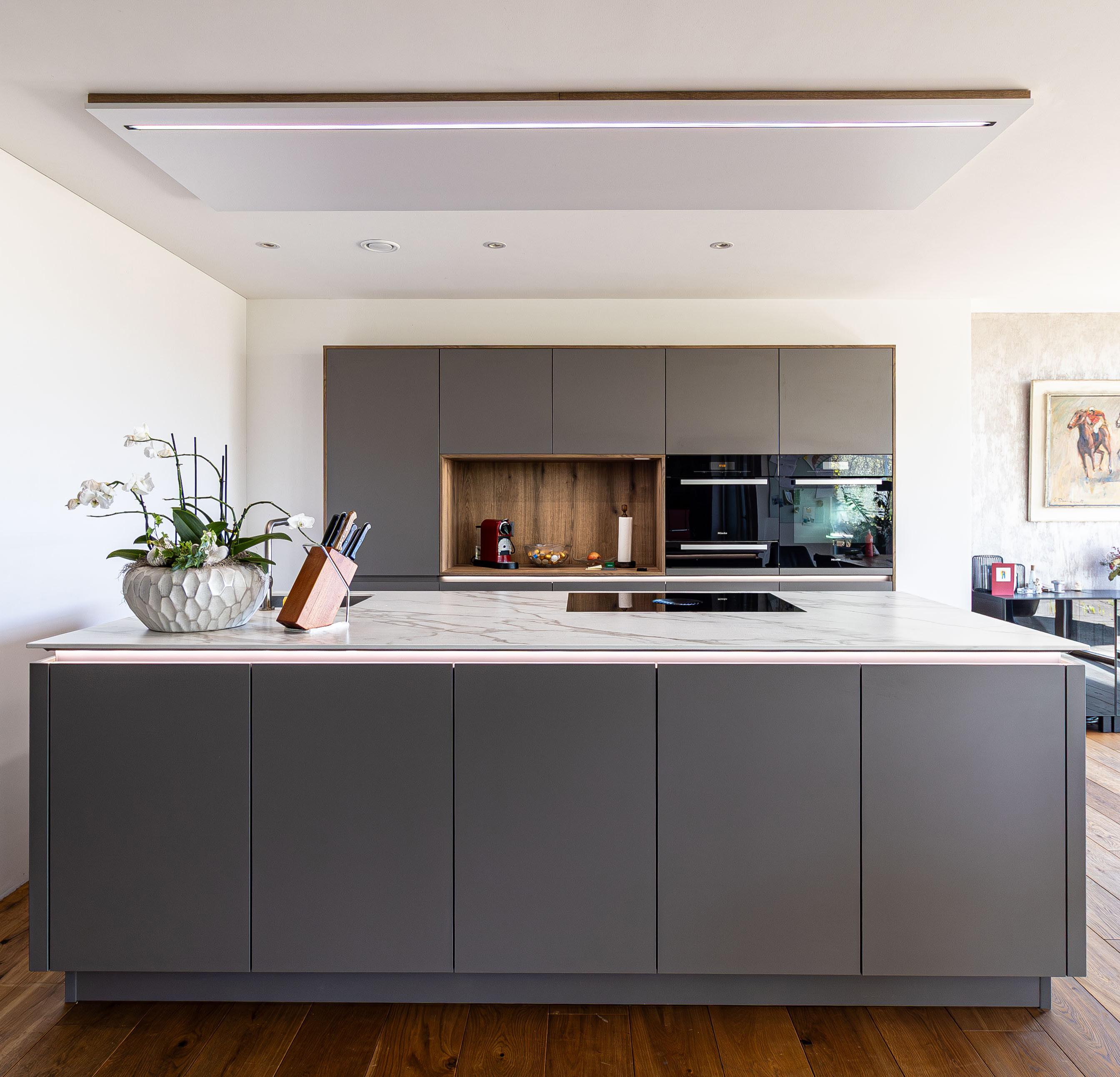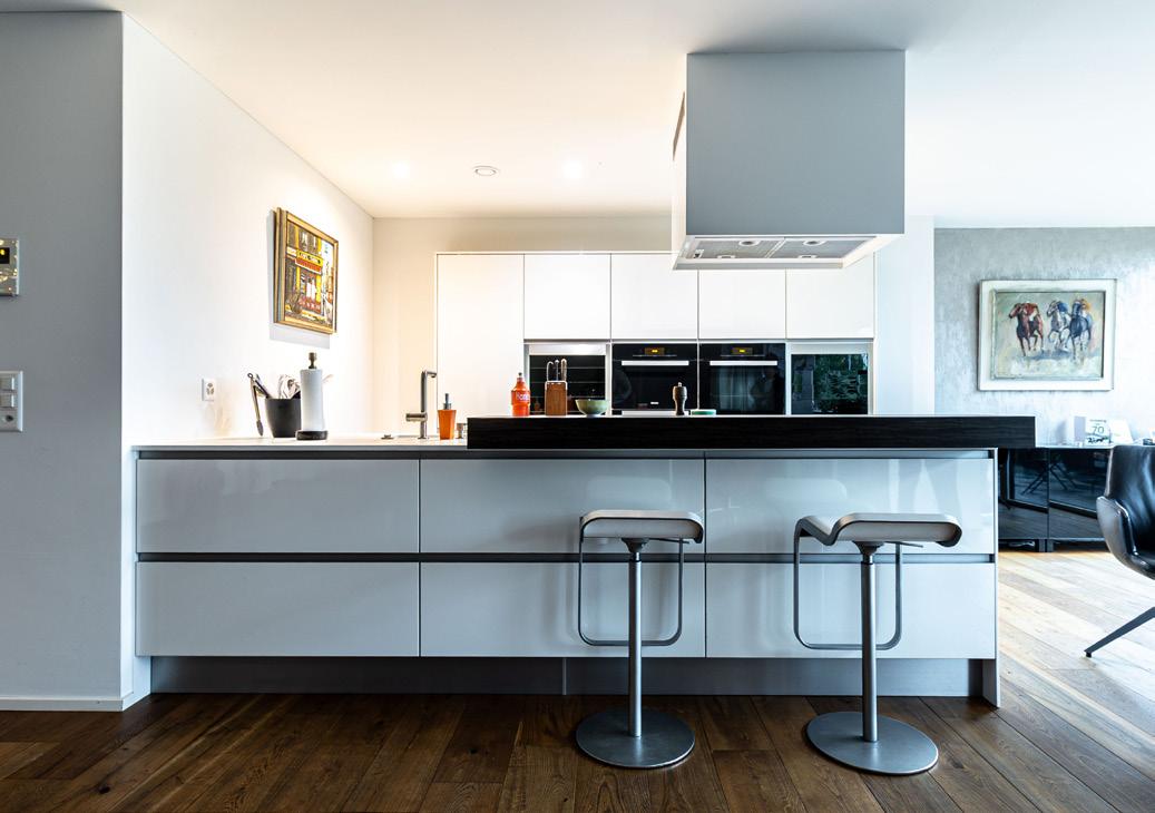 Die schwarz-weisse Hochglanzküche mit wuchtigem Dunstabzug wirkte unpraktisch und wenig harmonisch. Heute überzeugt eine moderne Kücheninsel in elegantem Grau mit stilvoller Arbeitsplatte, integrierter Kochfeldabsaugung und durchdachter Beleuchtung – für ein klares Design und mehr Bewegungsfreiheit.