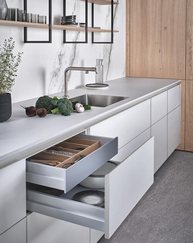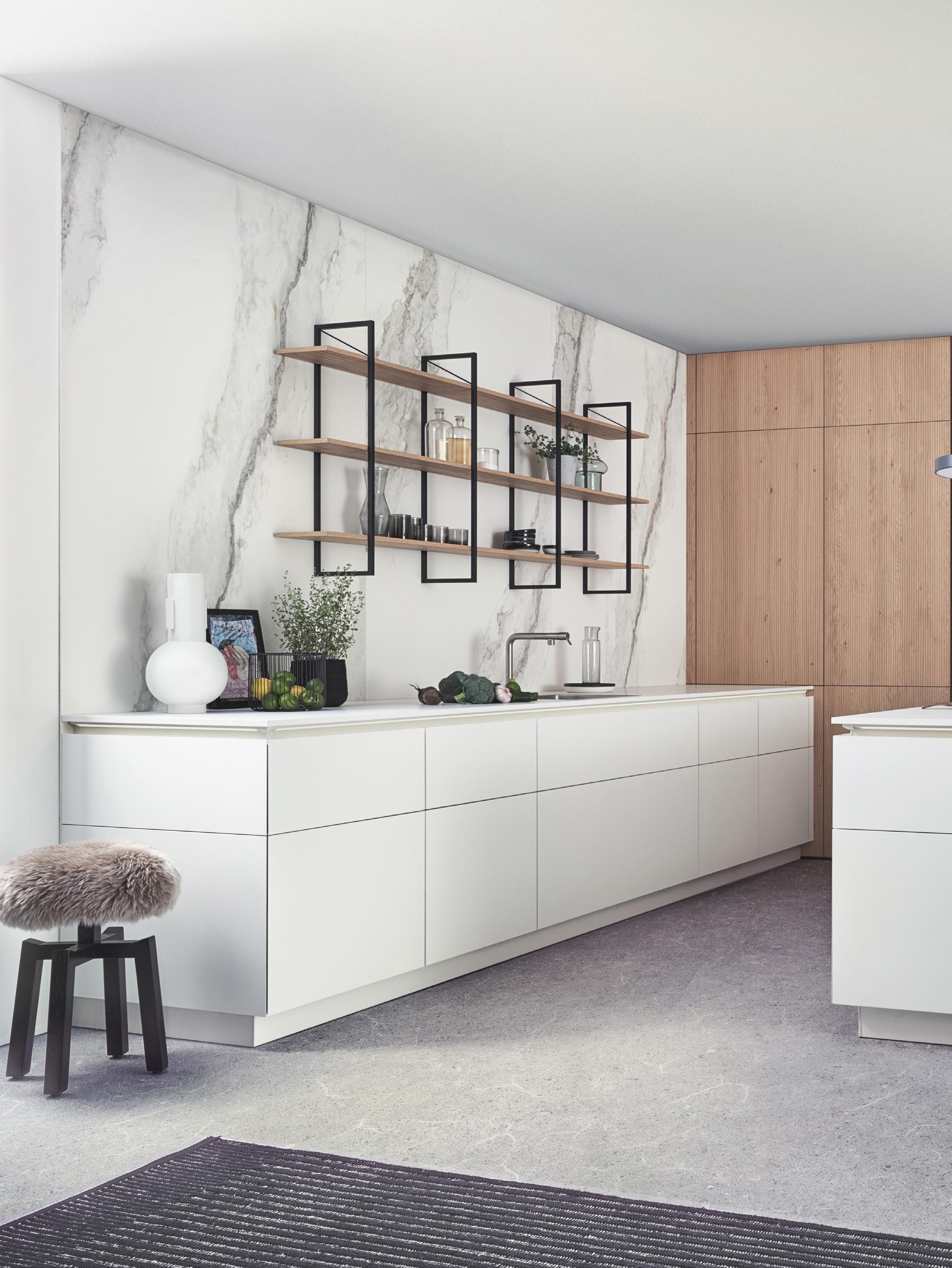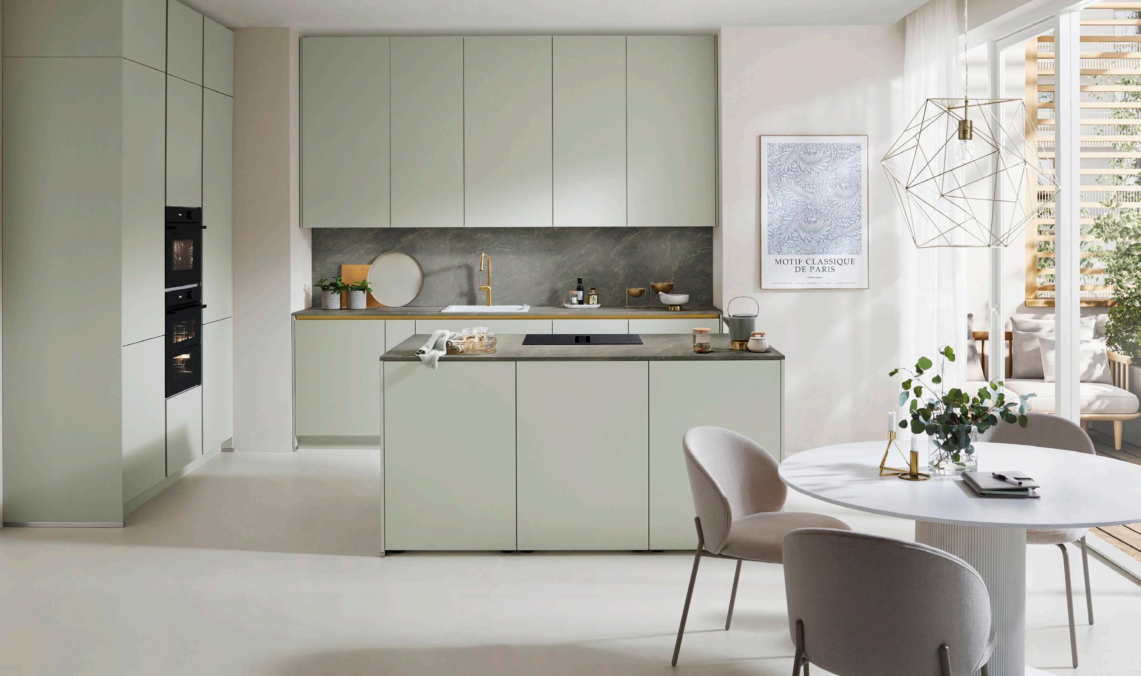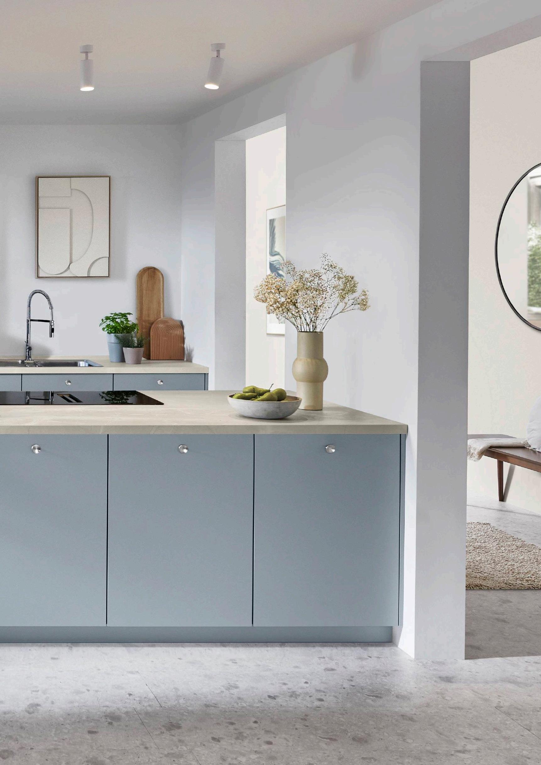 Eine besondere Farbnote und viel Raum für Ideen. Der zarte Pastellton Sky sorgt optisch für eine klare und aufgeräumte Atmosphäre durch die Ton-in-TonOptik. Typisch für die urbane Küchengestaltung: Funktionalität und Ästhetik werden eins.