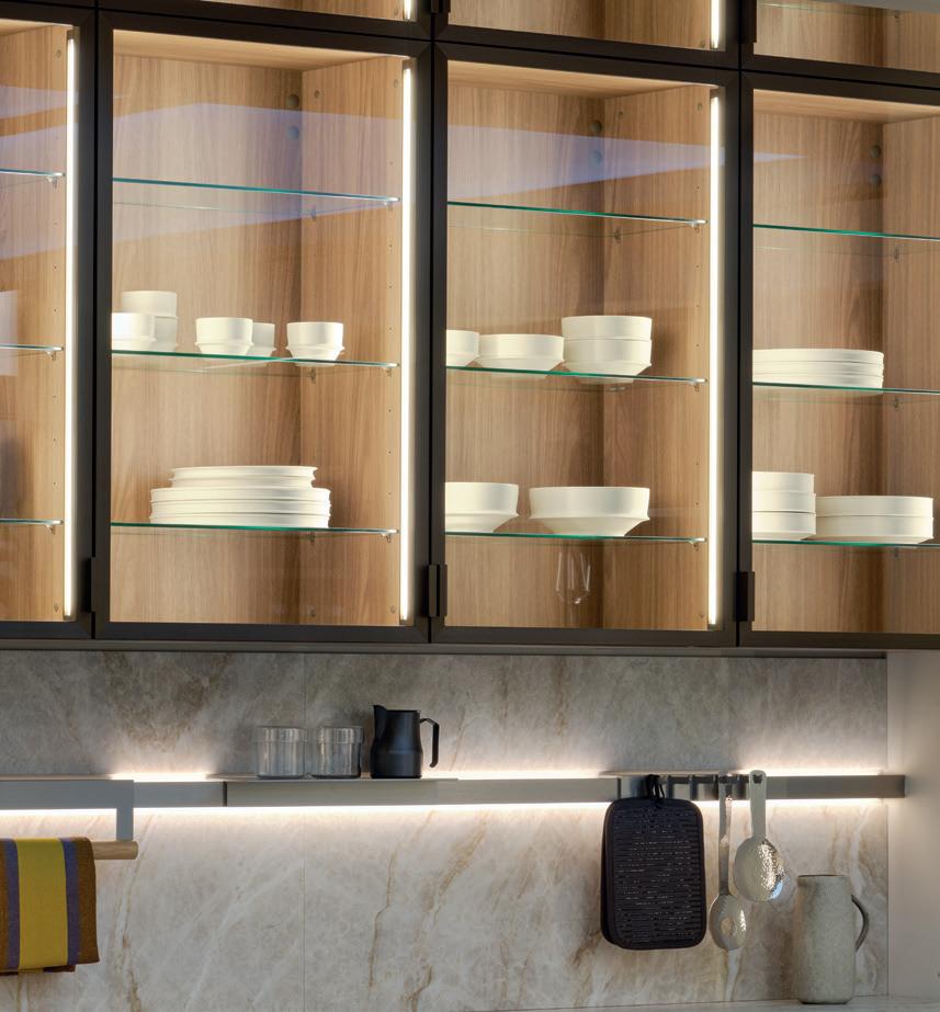 Die Küche strahlt zeitlose Eleganz aus. Die Hochschrankwand in Nussbaum verleiht Wärme und Charakter, während die Vero-Glas-Türen als Highlight fungieren und für eine moderne, luftige Atmosphäre sorgen. Dieses Zusammenspiel aus Farben und Materialien schafft einen stilvollen und einladenden Raum.
