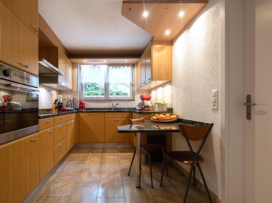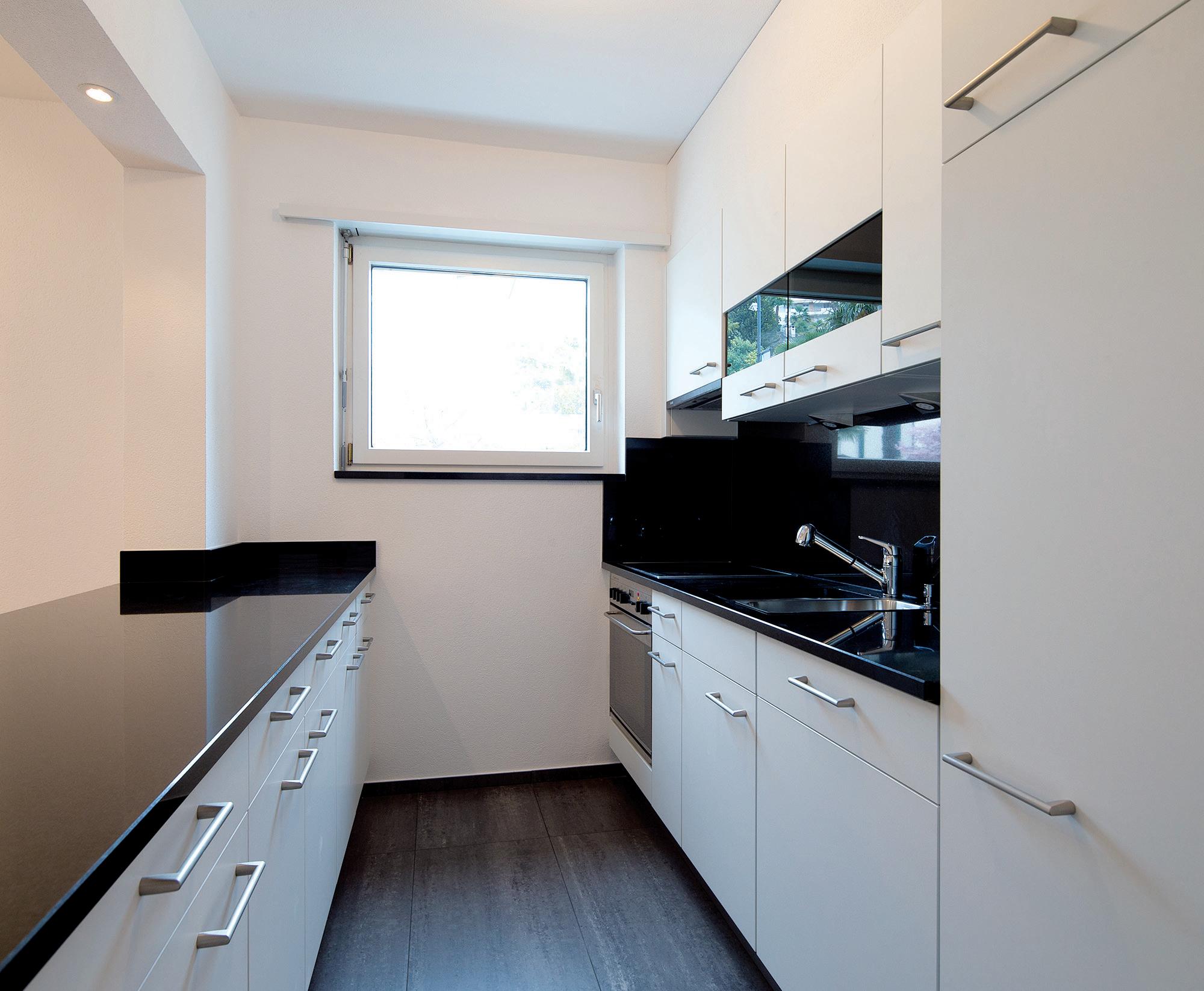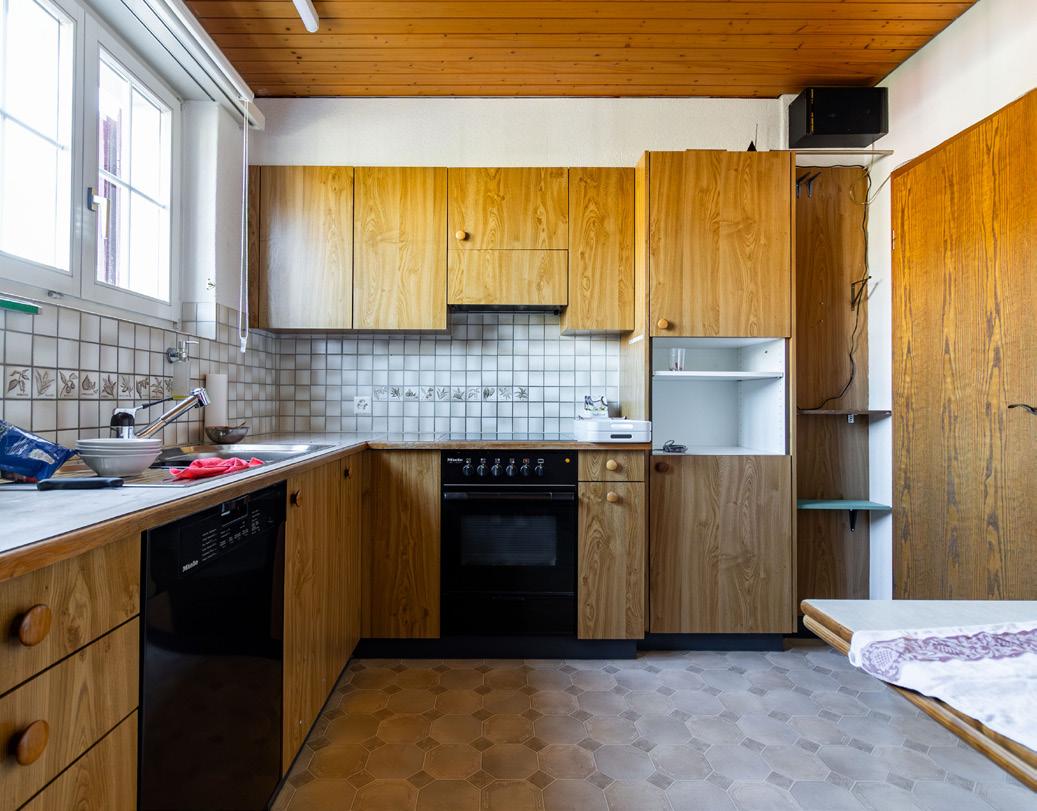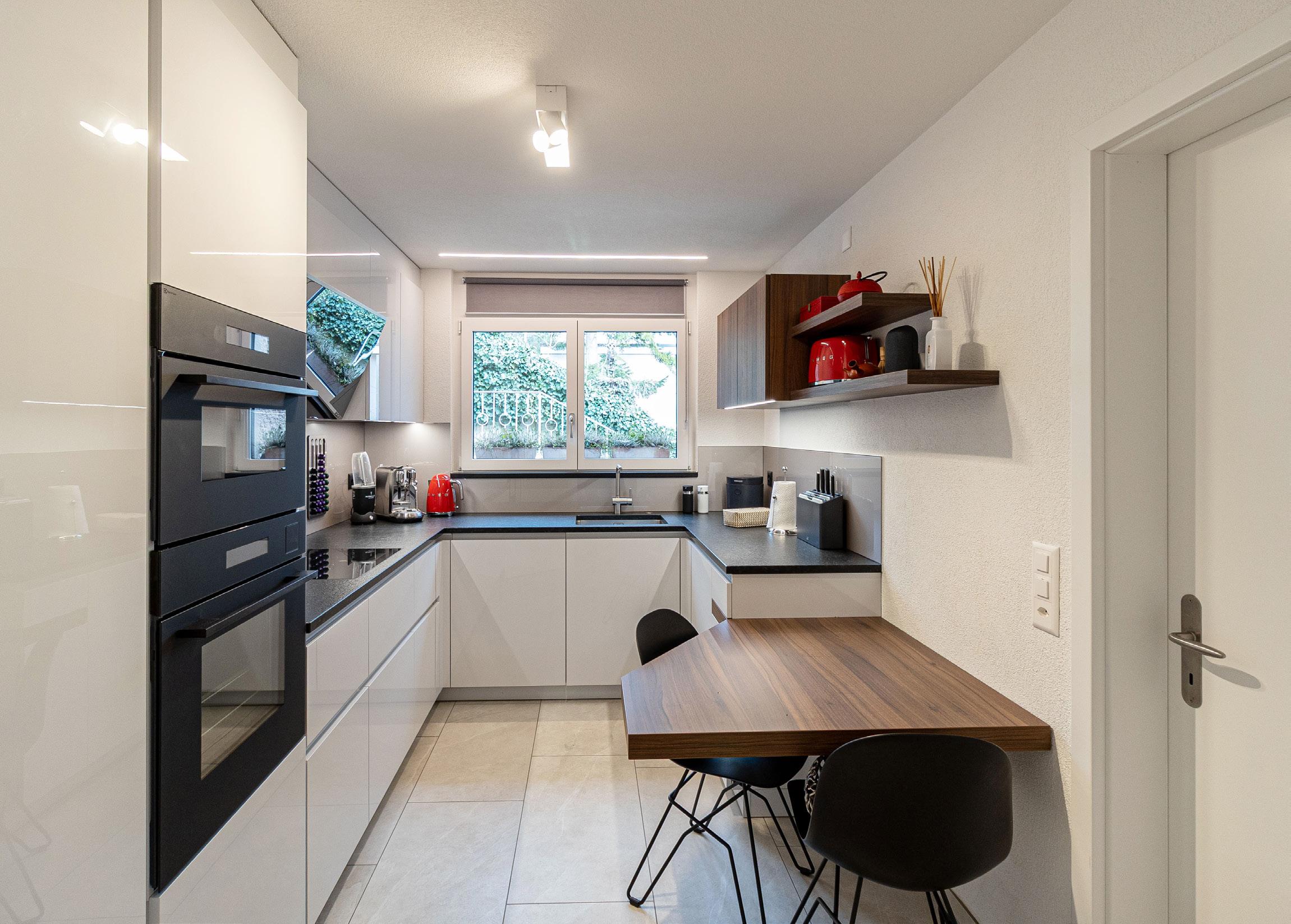 Die dunkle Küche mit Holzfronten, alten Geräten und Fenstern wirkte wenig einladend. Heute sorgt eine helle, weisse Einrichtung mit modernen Elektrogeräten, neuen Fenstern und einem freundlichen Boden für frischen Glanz. Die integrierte Essecke und stimmige Beleuchtung schaffen zusätzlichen Komfort und Wohnlichkeit.