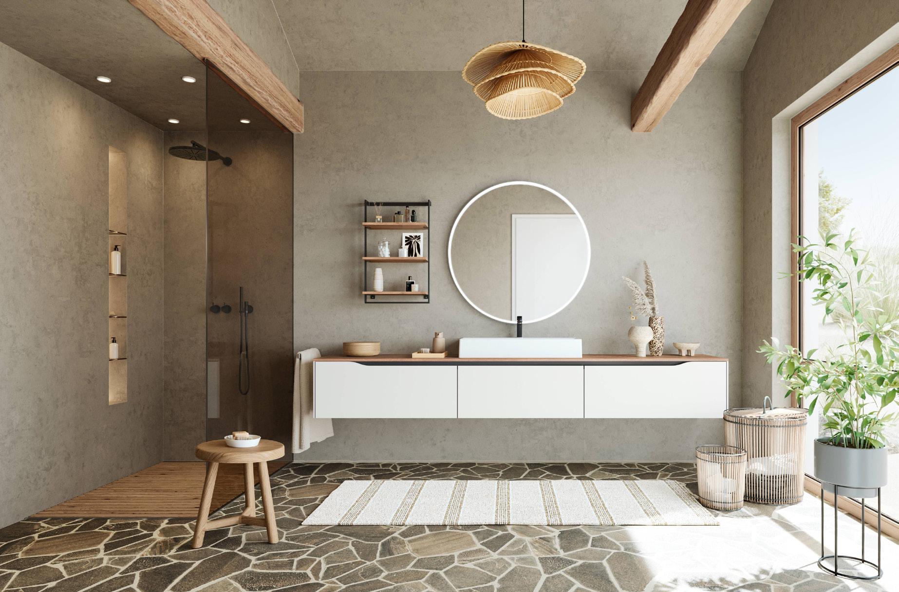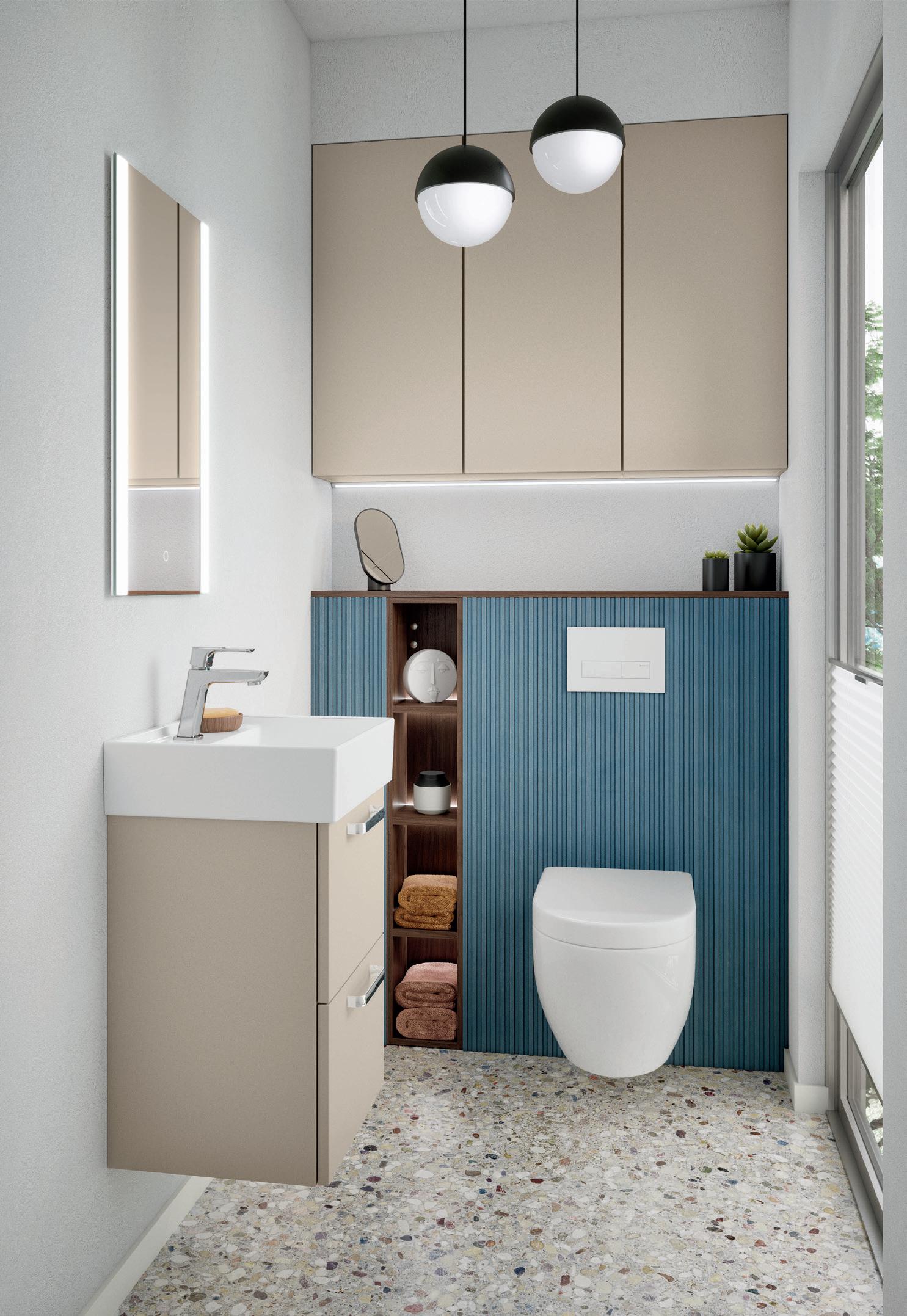 Mit kompakten Waschtischen, integrierten Stauraumlösungen und platzsparenden Armaturen entsteht ein harmonisches Gesamtbild, das Funktionalität und Design stilvoll vereint – auch auf kleinem Raum.