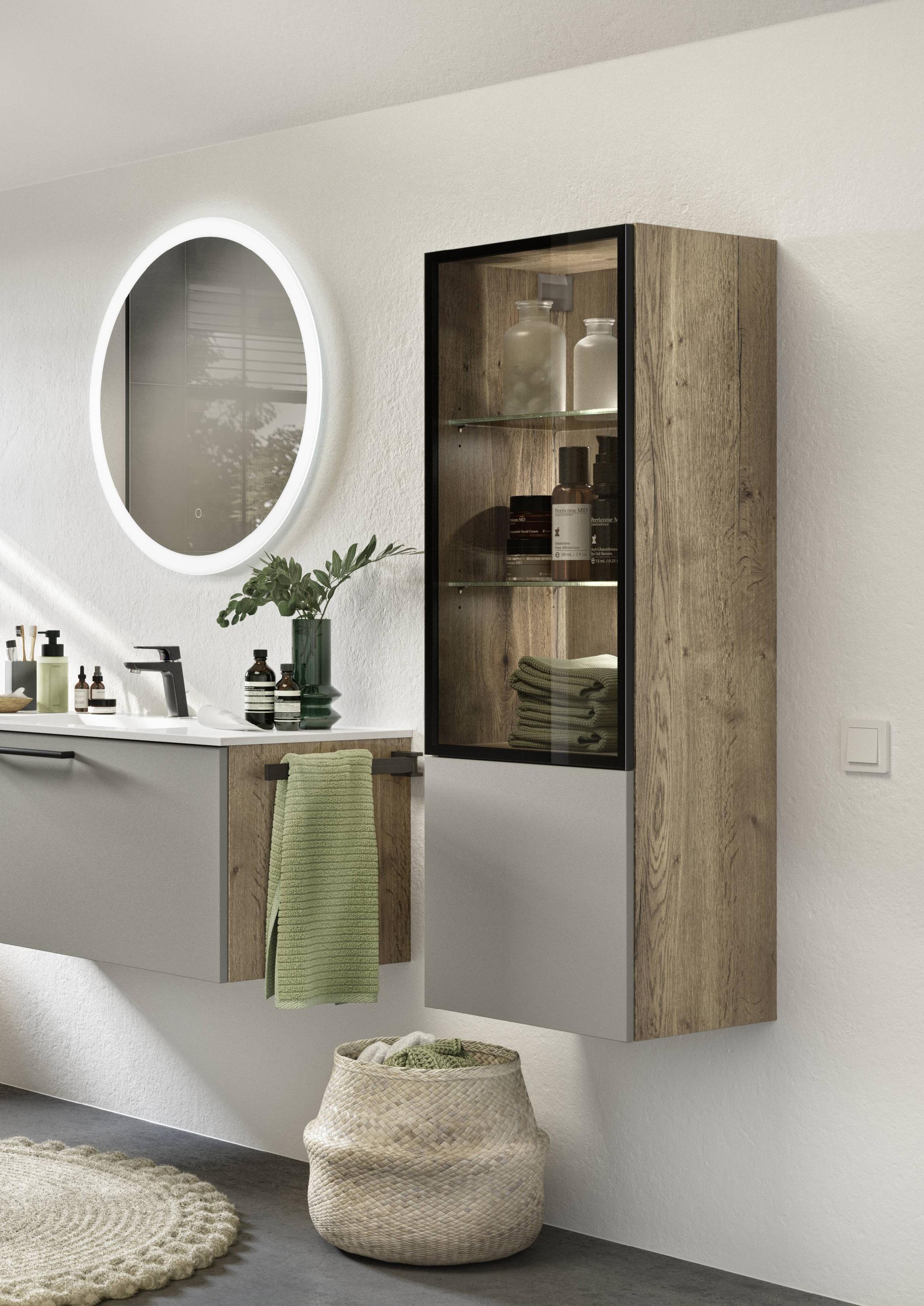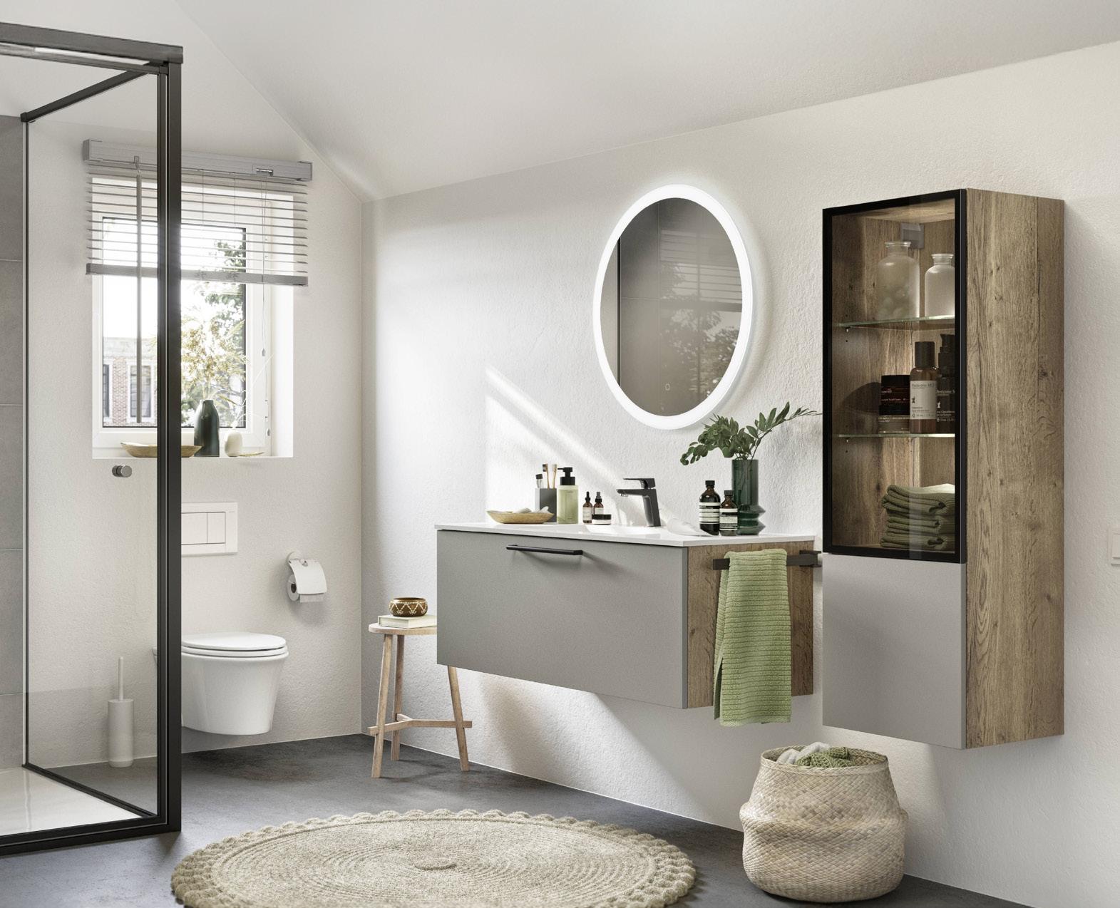 Möbel in sanftem Taupegrau und warmem Holz schaffen eine ruhige, wohnliche Atmosphäre. Glasflächen – wie bei der Dusche oder in offenen Vitrinenelementen – verleihen dem Bad optische Weite und Leichtigkeit. Clevere Stauraumlösungen nutzen den Platz optimal und halten alles griffbereit.