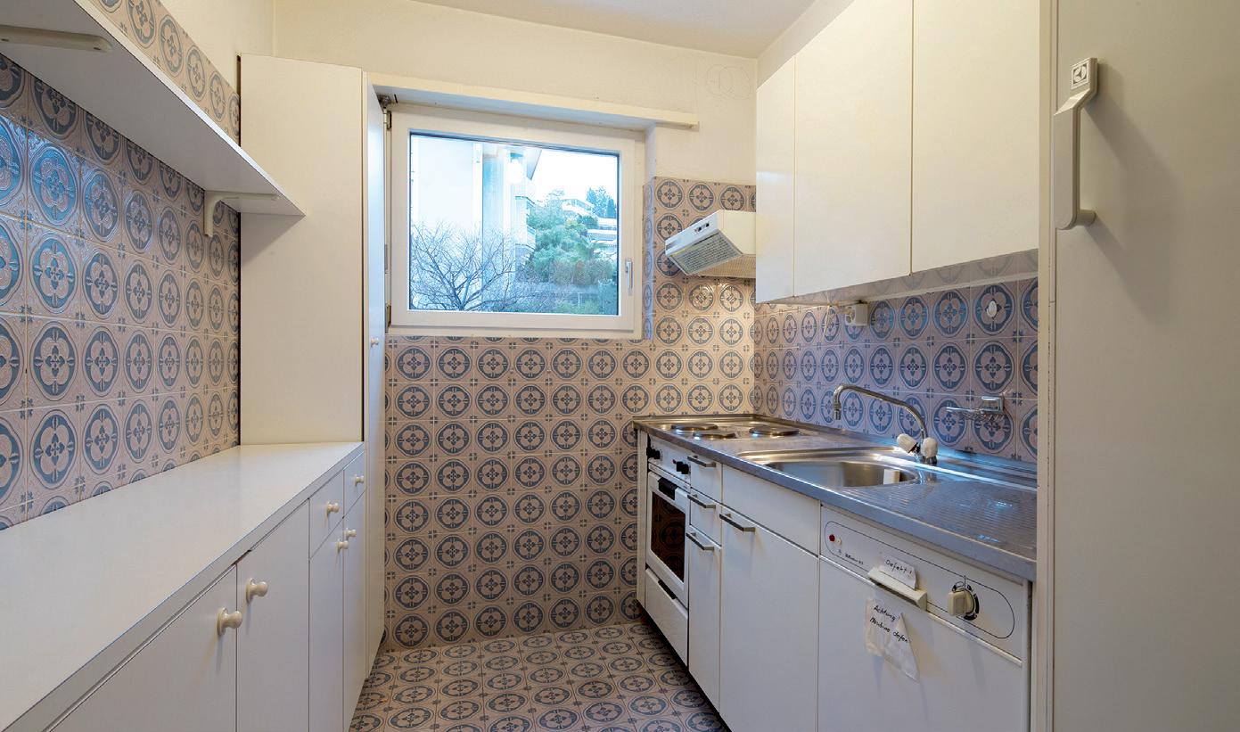 Die alte Küche: knarrende Schränke, bunte Fliesen und stromfressende Elektrogeräte in einem kleinen Raum.