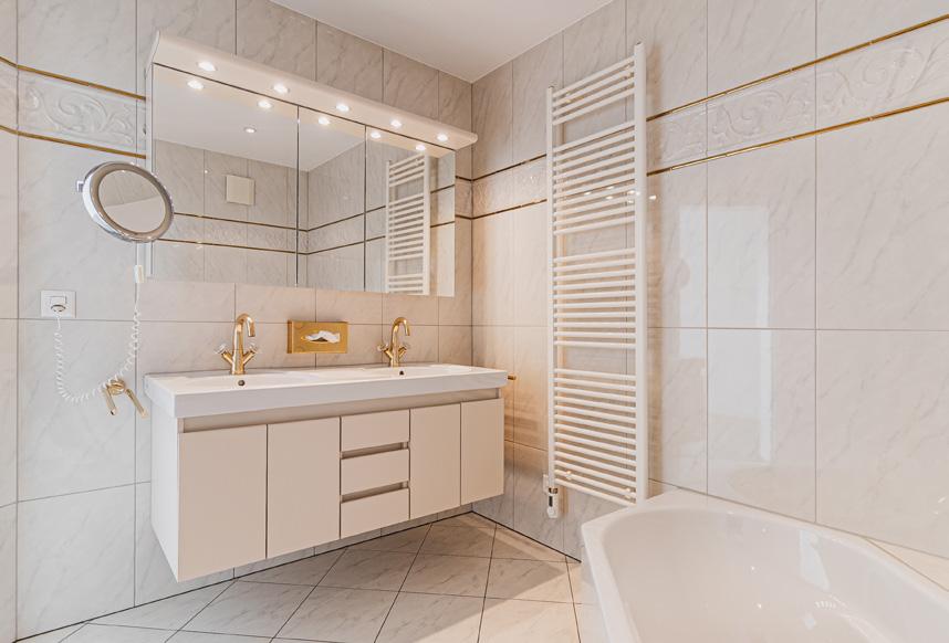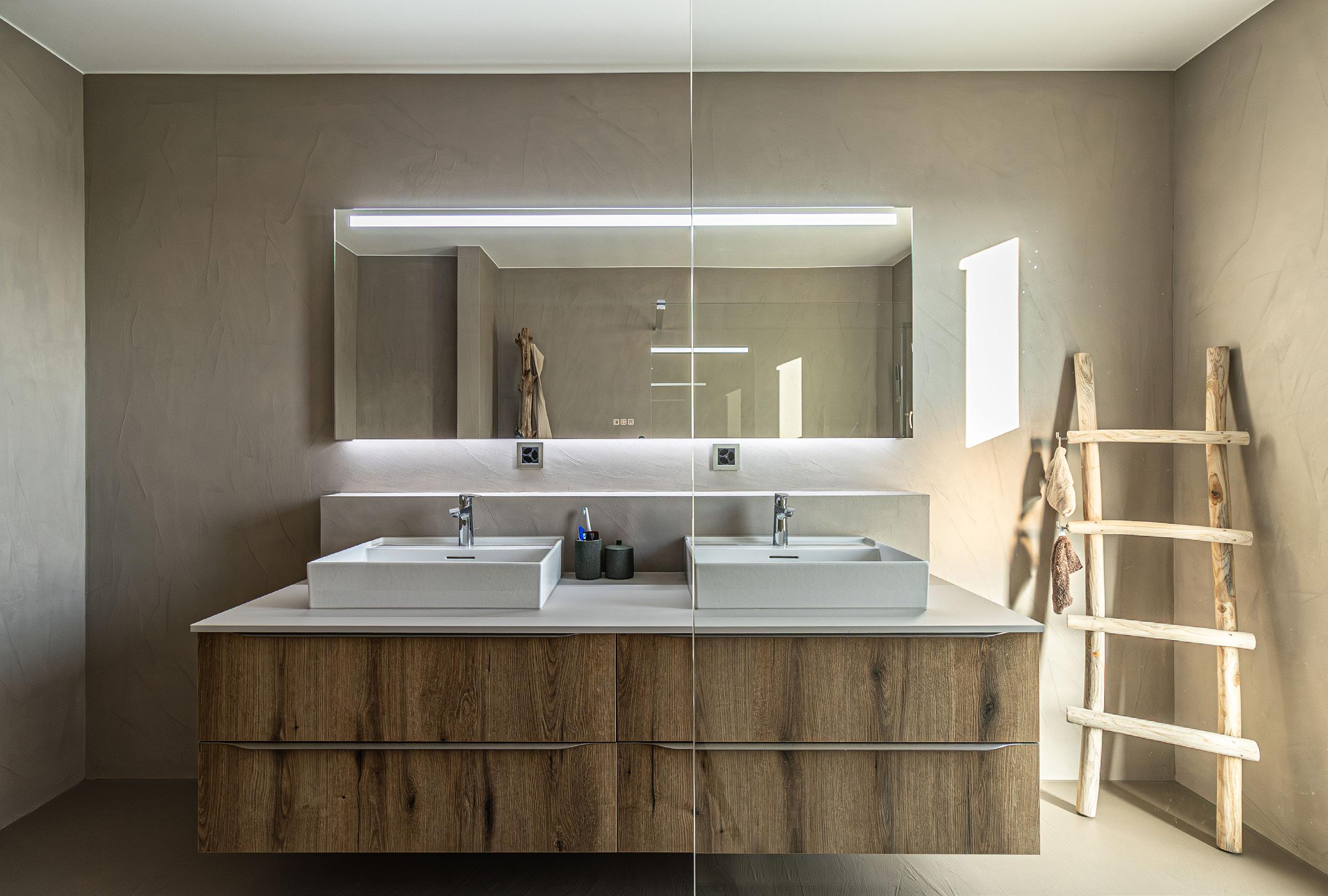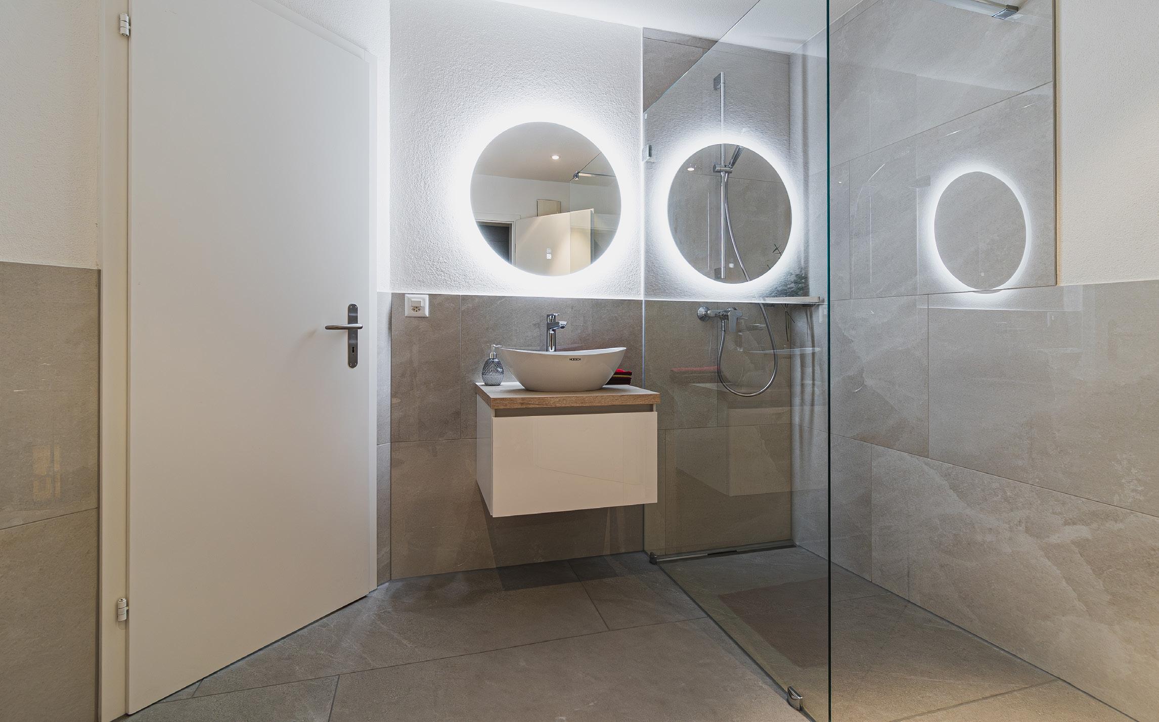Das Bad mit kleinen weissen Fliesen, grauen Möbeln und ungünstig platzierten Waschbecken wirkte kalt und beengt. Heute überzeugt ein warmer Holzunterbauschrank mit grossem, beleuchtetem Spiegel. Die neue Wand- und Bodengestaltung in harmonischen, warmen Tönen verleiht dem Raum Ruhe und zeitlose Eleganz.
