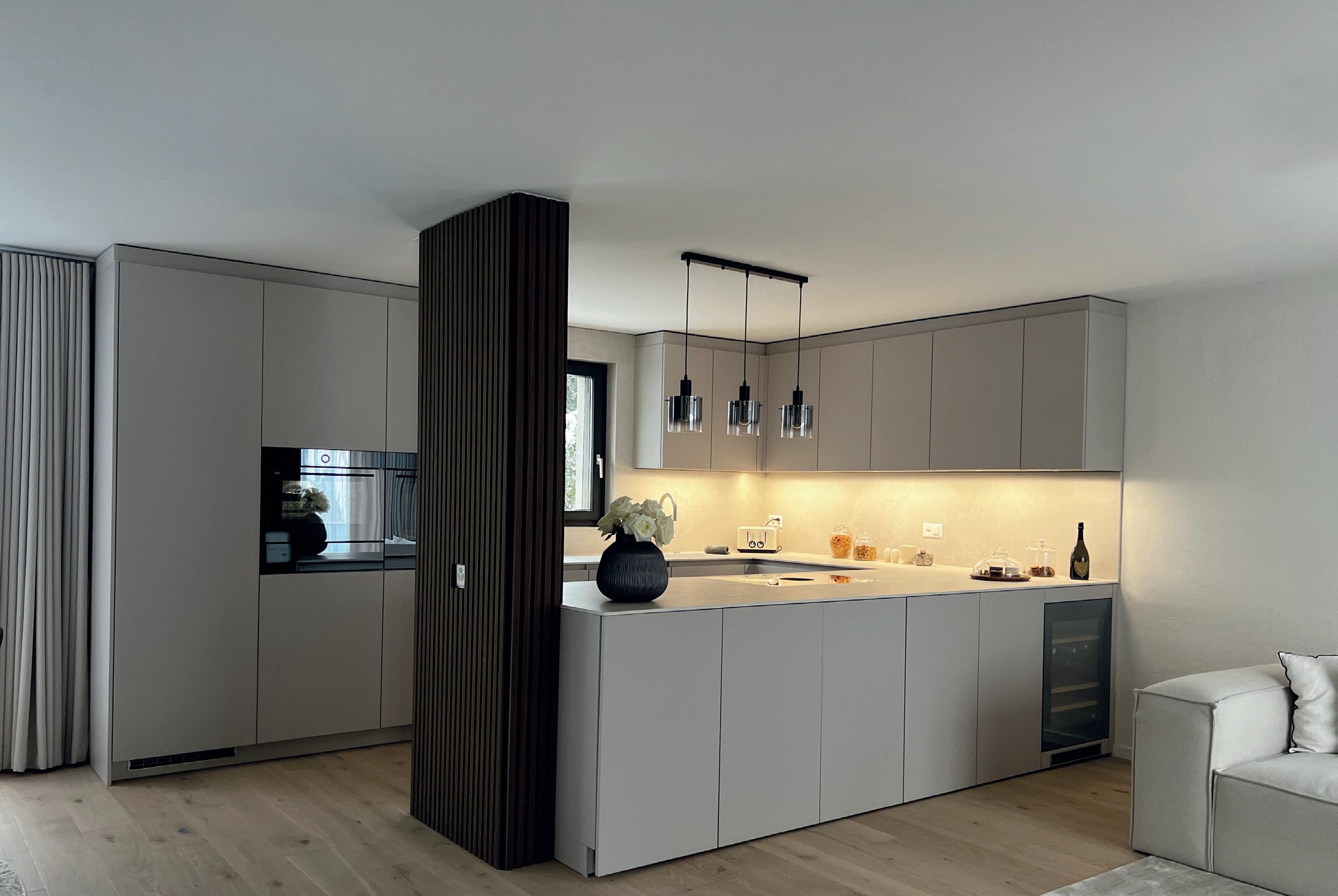 Ob Fronten, Decke, Boden oder Wand –bei diesem Umbau wurde alles neu gedacht. Die Küche verschmilzt nun mit dem Wohnraum und schafft eine helle, freundliche Atmosphäre zum Kochen, Leben und Geniessen.