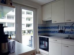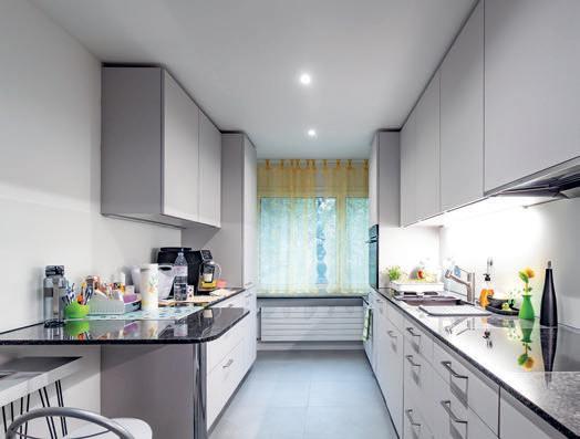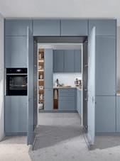 Peu de place, mais des idées à profusion. La douceur du bleu ciel et le choix du ton sur ton donnent une impression de clarté et d'ordre. Comme dans toute cuisine urbaine, fonctionnalité et esthétique ne font qu'un. Les portes vers les autres pièces et l'arrière-cuisine sont habilement intégrées au plan d'ensemble.