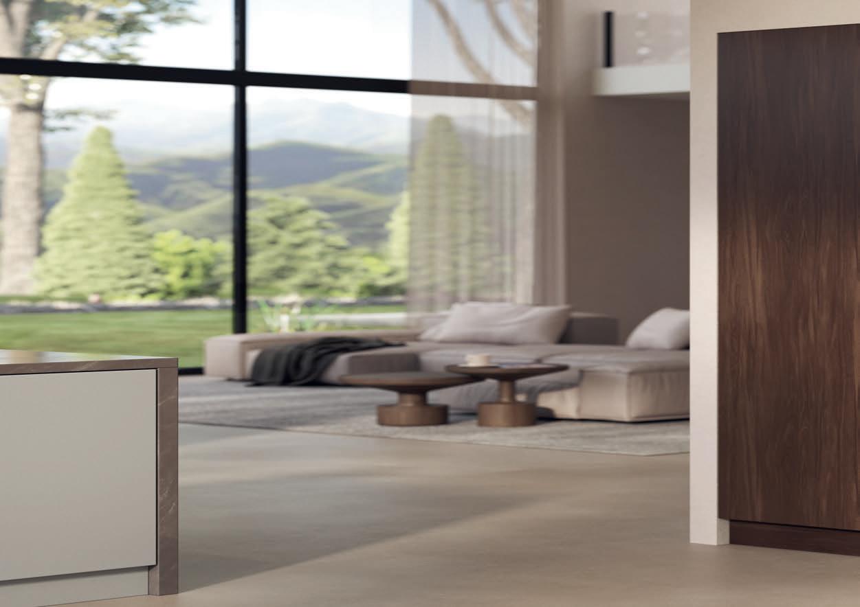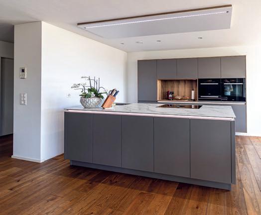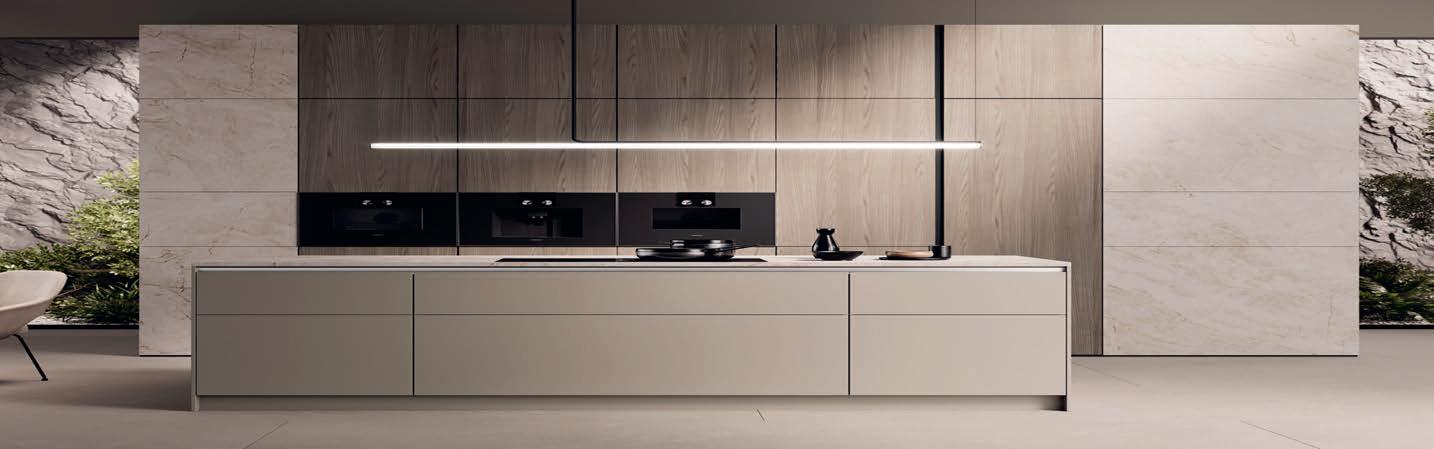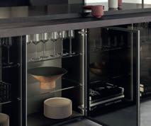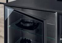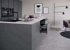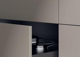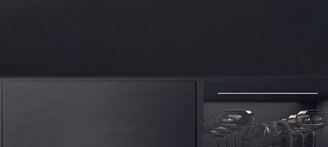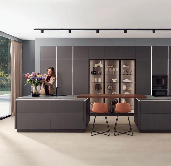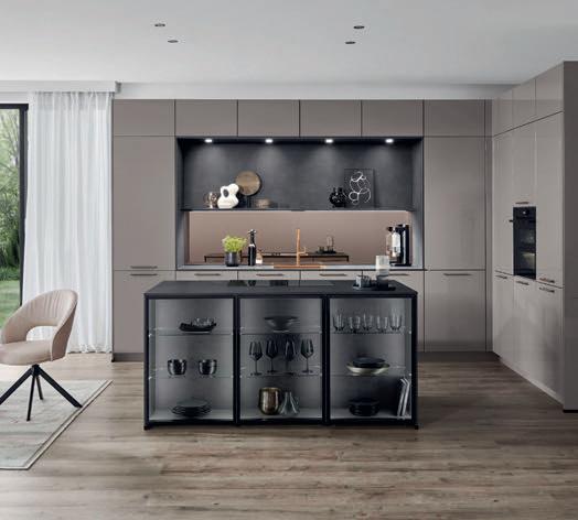 Sublime dans toutes ses nuances. Le gris taupe est une couleur naturelle idéale pour créer une atmosphère paisible et raffinée. Les façades en laque brillante sont mises en valeur par des détails couleur de bronze et des matériaux sombres inspirés par la nature. Il en résulte une composition claire et stylée aux contrastes subtils, que la vitrine Air de l'îlot central vient rehausser de ses portes vitrées grises. Les vitrines Air avec leur fin cadre en aluminium soulignent la sobriété du design, sans charnières apparentes.