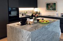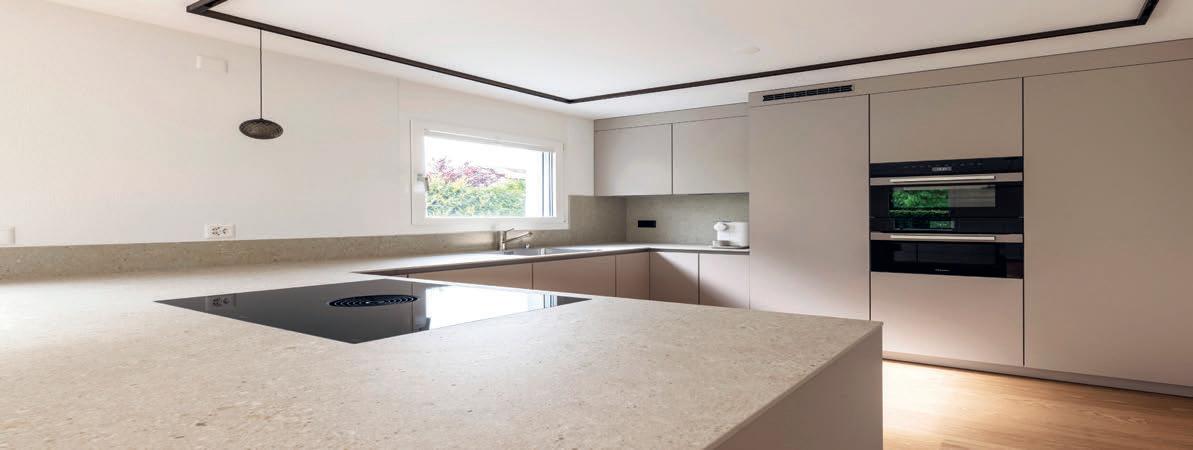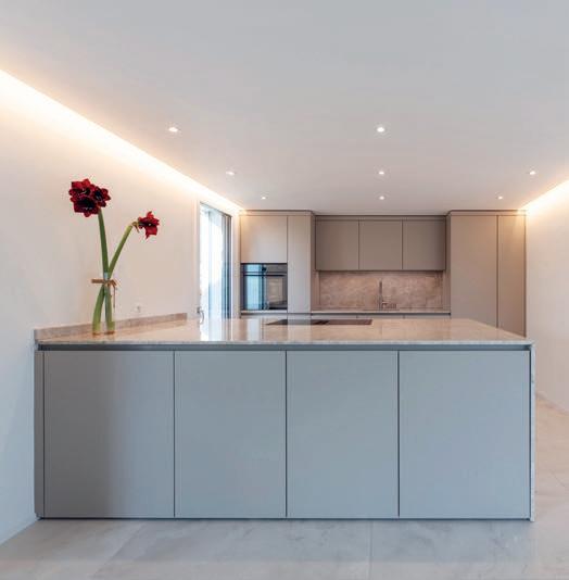 Trois éléments phares caractérisent l'agencement de cette cuisine. Le placard au design apaisant qui occupe toute la hauteur jusqu'au plafond, les façades ROCCA en pierre naturelle qui l'encadrent, et l'imposant îlot central qui complète le tableau en harmonie avec la légèreté du jeu de couleurs.
